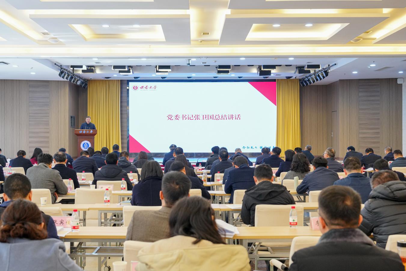 本次述职采取书面和现场相结合的方式,与会人员在会前根据书面述职材料完成在线测评。现场述职采取党委常委会扩大会议的形式,分两个阶段进行。学校15名二级党组织书记代表以及9名机关部门和直属单位党支部书记代表依次述职,介绍本单位上年度问题整改落实情况、2025年主要做法及成效、存在问题及原因分析,阐述2026年具体目标举措。