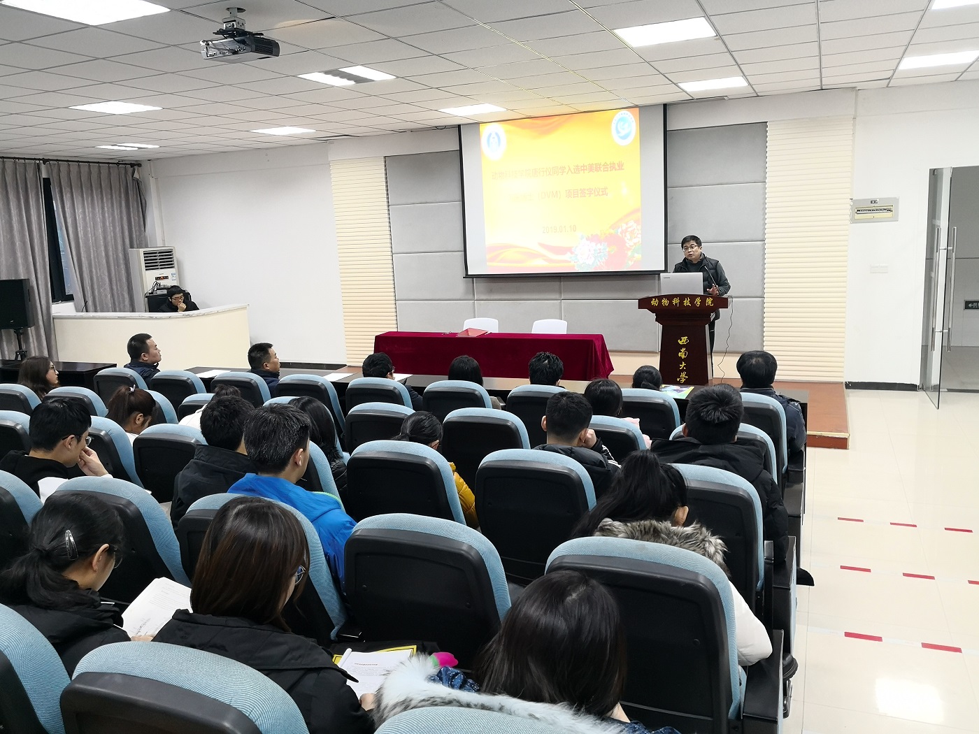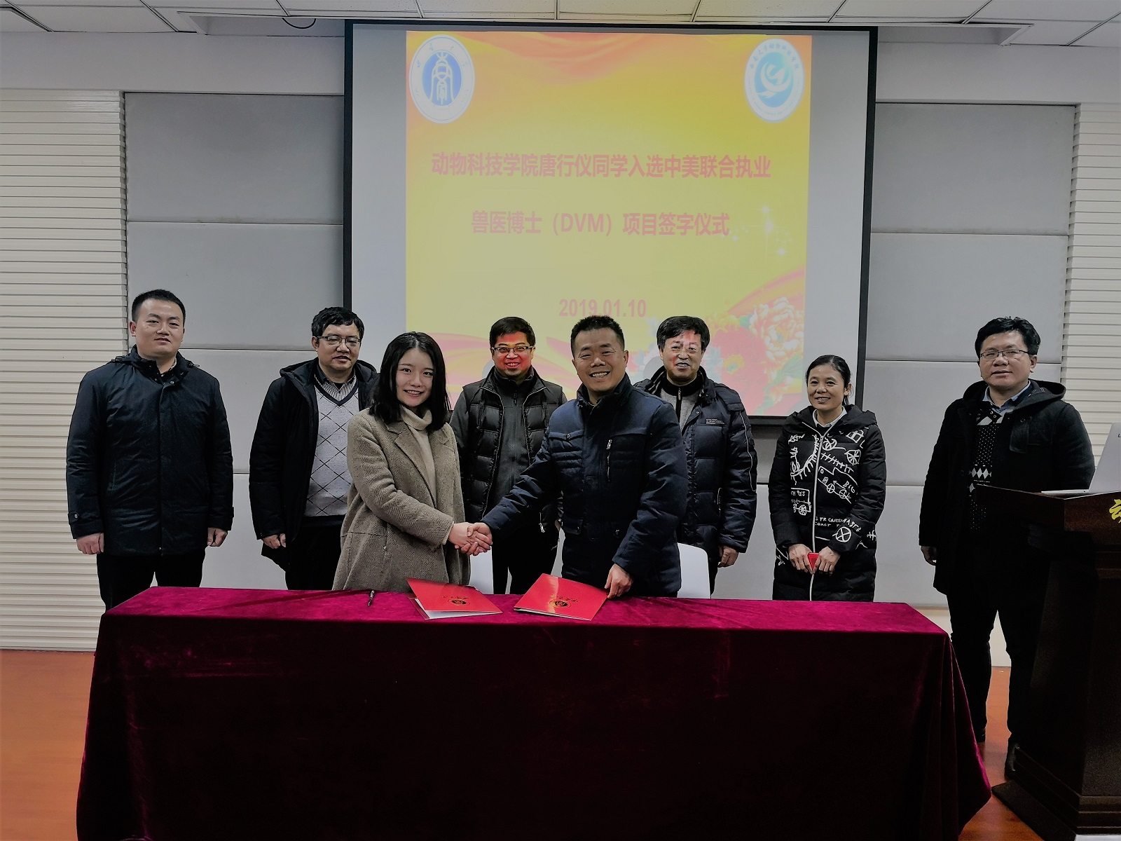 1月10日下午,动物科技学院举行“动物科技学院唐行仪同学入选中美联合执业兽医博士(DVM)项目签字仪式”。 本次签字仪式由动物科技学院书记王豪举主持,出席仪式的有国际合作与交流处处长张发钧,动物科技学院院长赵永聚以及学院专家学者和师生代表。