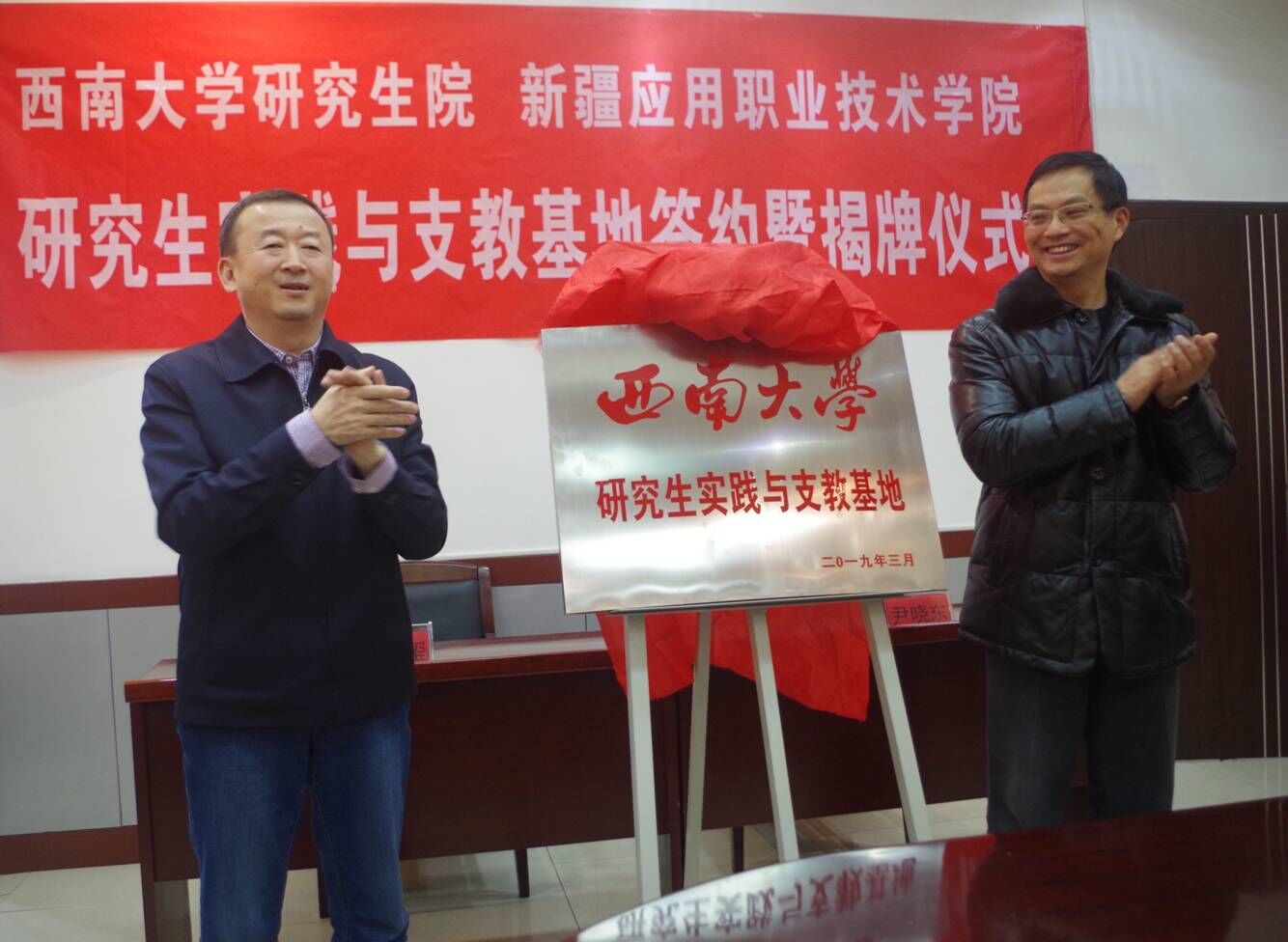 3月6日,taptap点点官方网站研究生院与新疆应用职业技术学院(以下简称“应职院”)“研究生实践与支教基地”签约揭牌仪式举行。应职院党委书记韩春玺,党委委员、副院长努尔兰·白斯汗,taptap点点官方网站党委研究生工作部部长、研究生院副院长尹晓东,研究生院副院长涂涛,援疆挂职干部、应职院副院长王文余出席仪式。taptap点点官方网站党委研究生工作部、研究生院相关科室负责人,应职院干部教师代表,第一期支教团16名研究生志愿者参加仪式。