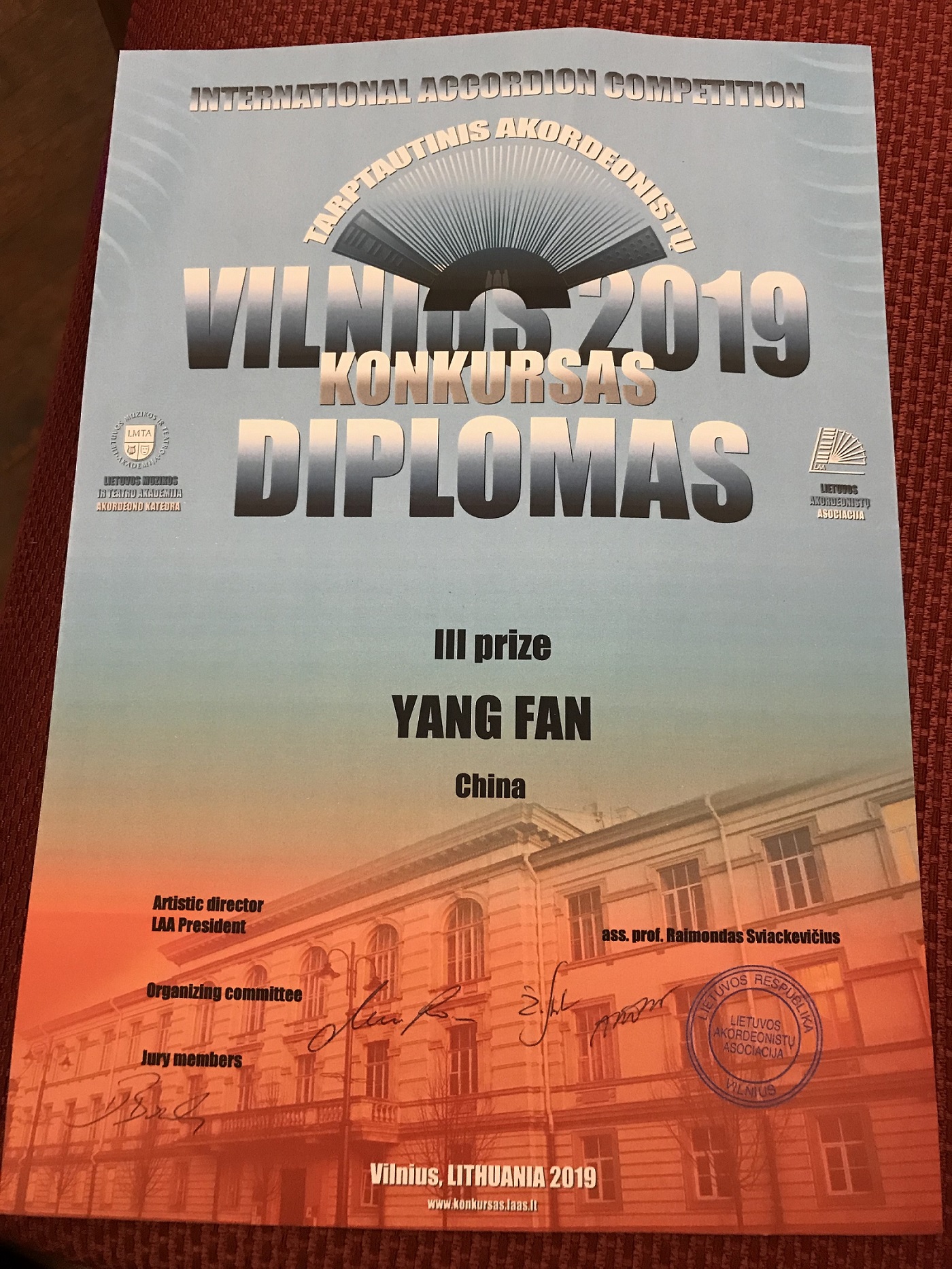 范洋在2019立陶宛维尔纽斯国际手风琴比赛中获奖