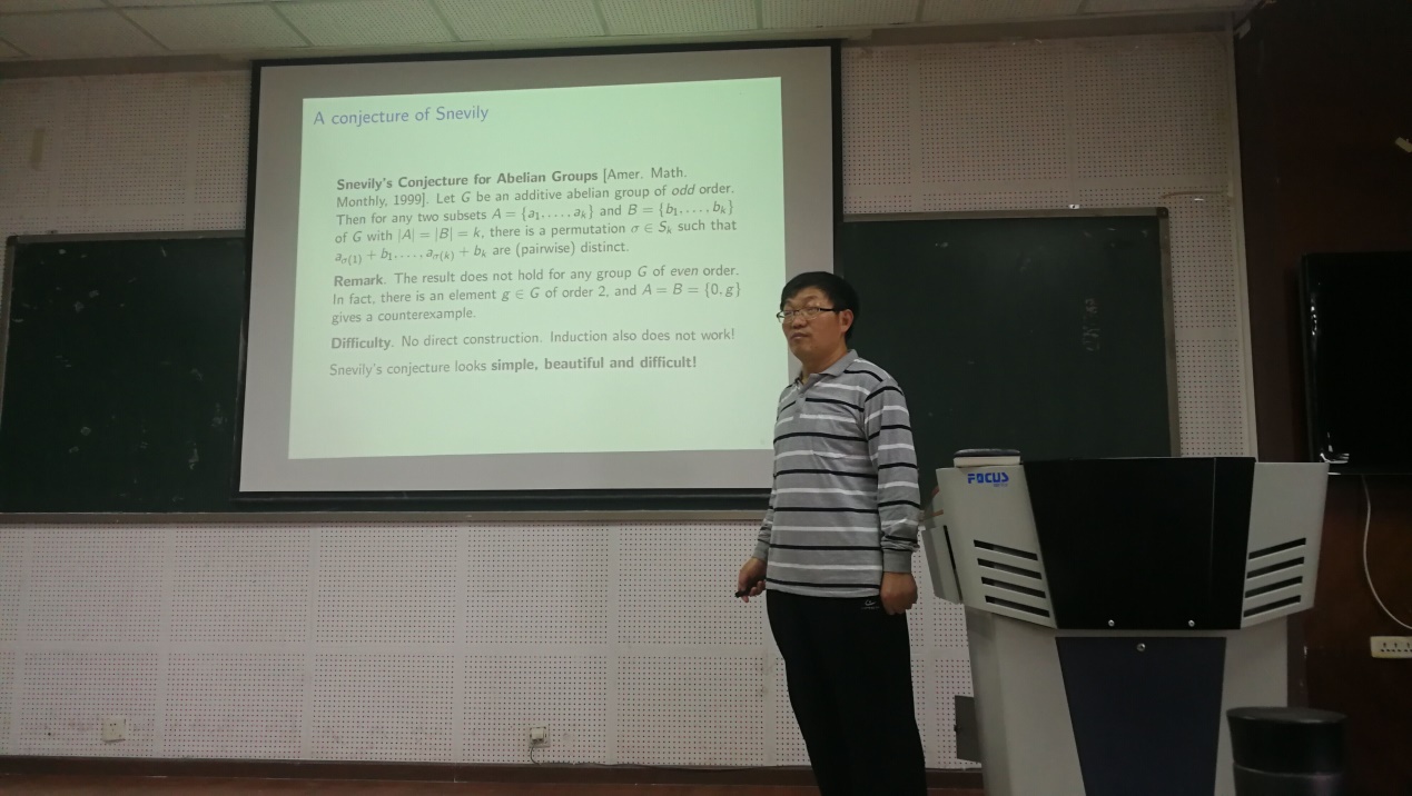 孙智伟教授作了题为“Snevily猜想及其相关”的学术报告。孙教授谈到,设G是奇数阶的有限阿贝尔群,1999年,H.S.Snevily推测,对于G的任何两个子集A和B,|A| = |B| = n,存在A的元素{a_i }_(i=1)^n和B的元素{b_i }_(i=1)^n,使得a_1+b_1, . . . , a_n+b_n是成对不同的。孙智伟教授通过Alon的Combinatorial Nullstellensatz回顾了这个猜想的初步进展,以及Feng-Sun-Xiang通过阿贝尔群的特征研究相关的Dasgupta-Karolyi-Serra-Szegedy猜想。最后,孙教授讨论了B. Arsovski对Snevily猜想的优雅解决方案,并对有限阿贝尔群体提出了一个新的猜想。