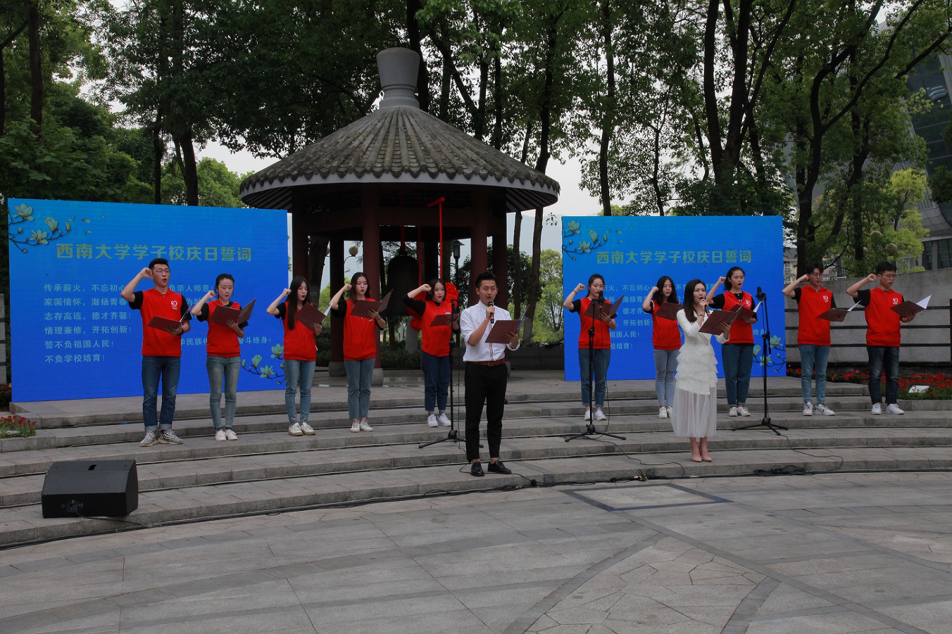 4月18日,伴随着国歌响起,红旗飘扬,taptap点点官方网站第113周年校庆纪念暨第二届“校园开放日”主题活动启动仪式在校庆纪念园举行。校团委学生艺术团带来了开场舞《青春舞曲》和合唱校歌,校领导和师生代表、校友代表撞响钟声,参加此次仪式的有报考西大的考生及考生家长、在校师生代表、校友代表、媒体代表以及社会各界人士,数学系69级51名老校友也光临现场,共同为taptap点点官方网站113岁生日送上祝福。