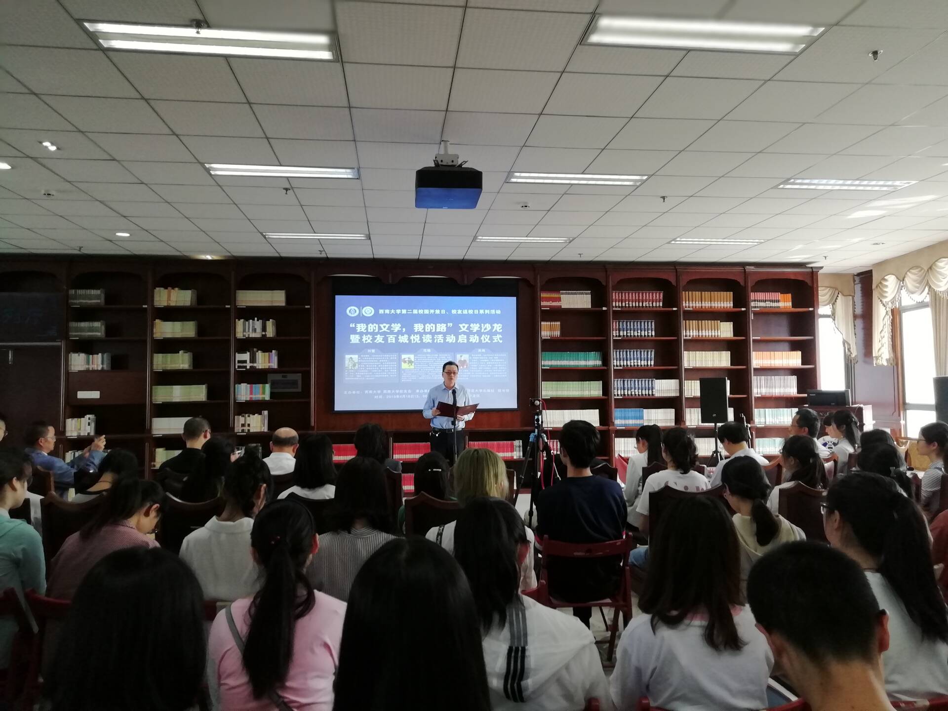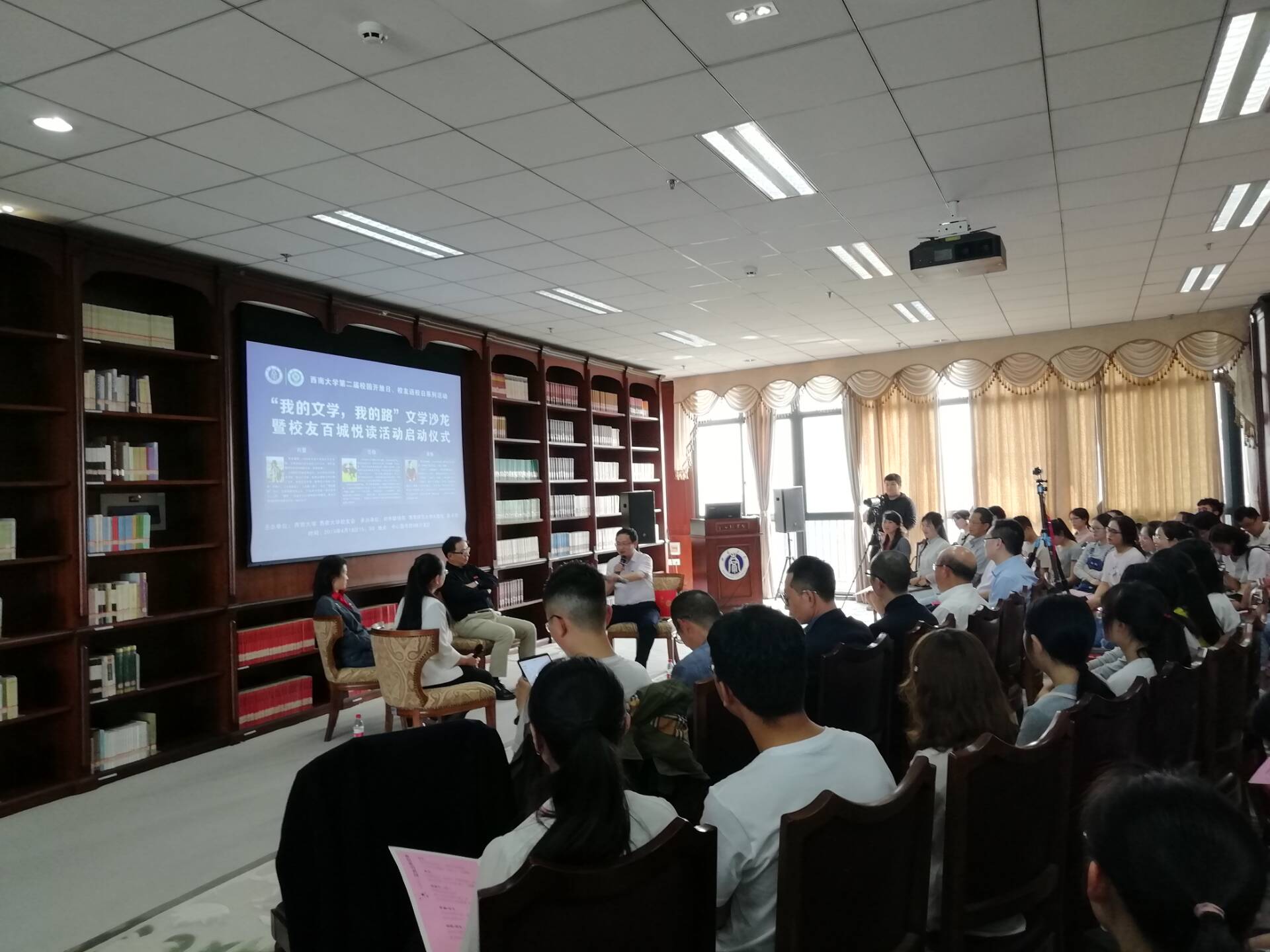 4月18日,学校第二届校友返校日系列活动之“我的文学我的路”校友文化沙龙暨校友百城悦·读活动启动仪式在中心图书馆举行。副校长温涛、对外联络部部长龚常智、文学院党委书记黄杰、图书馆副馆长李立新、出版社社长米加德等领导出席仪式。80级校友、西藏自治区政府副秘书长、新闻发言人刘萱女士,81级校友、云南省作家协会主席范稳先生,83级校友、著名作家吴梅影女士应邀做客沙龙。仪式由对外联络部副部长封云主持,沙龙由校工会副主席郑劲松主持。