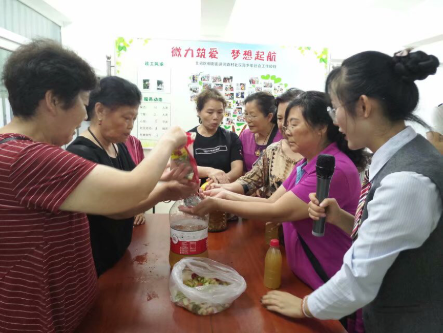 教育学部实践小分队在北碚区河嘉村社区,除了给居民讲解垃圾分类的小知识以外,开展了两场变废为宝的专题活动。队员们教会社区的阿姨们用果蔬皮等厨余垃圾制作成环保酵素,引导居民积极参与环境保护。同时,小分队也不忘“垃圾分类要从娃娃做起”,带领社区儿童一起收集废弃的瓶瓶罐罐,并将手中的废品变为精巧的手工艺品。