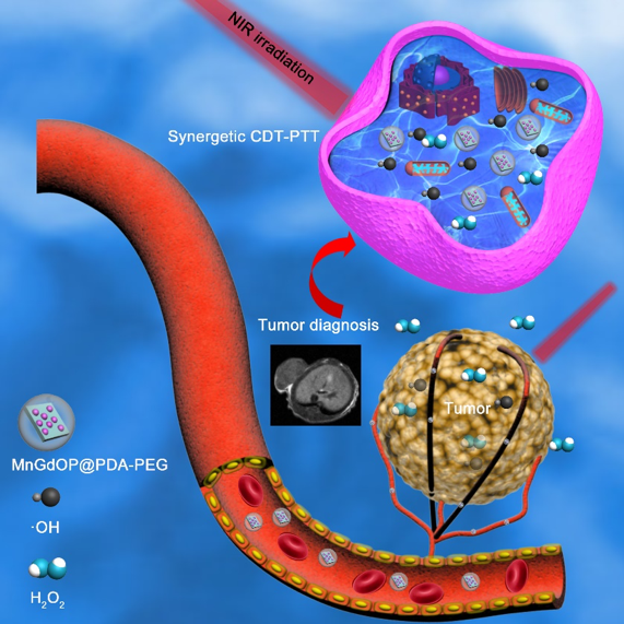 化学动力学治疗作为近年来备受关注的肿瘤治疗方法,旨在通过在肿瘤部位特异性的产生自由基,进而杀死肿瘤细胞达到肿瘤治疗的效果。与此同时,磁共振介导的肿瘤诊疗一体化试剂是近年来纳米药物领域的重要研究方向。赵征寰博士课题组通过可控合成对氧化钆磁共振纳米造影剂进行结构优化,成功引入具有化学动力学功效的锰离子和具有光热治疗效果的聚多巴胺。该诊疗一体化试剂具备较好的磁共振造影成像能力,成功实现在T1模式下的肿瘤诊断。与此同时,该诊疗一体化试剂可以利用其光热转换能力在实现光热治疗的同时,提高肿瘤部位的局部温度,进而提高羟基自由基在肿瘤部位的产生效率,从而提高化学动力学治疗的效果。