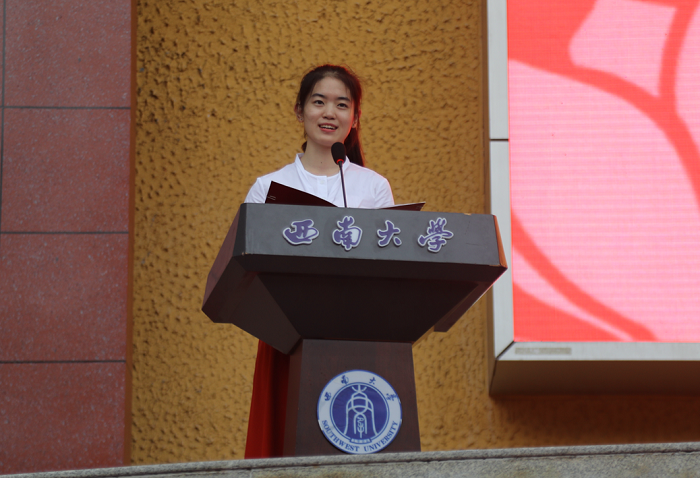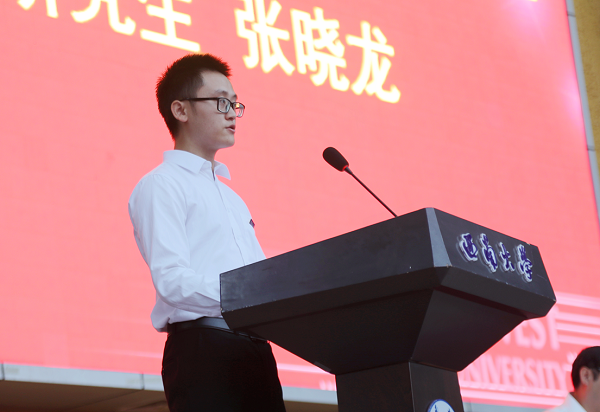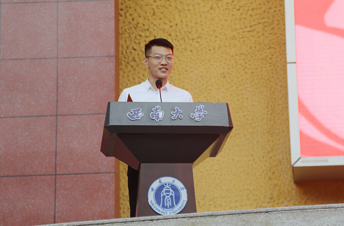 化学化工学院2019级分析化学专业博士研究生张晓龙、含弘学院2019级本科生杨蓓分别作为研究生和本科新生代表发言。张晓龙表示会珍惜在西大的每分每秒,铭记“含弘光大、继往开来”的校训,传承“特立西南、学行天下”的大学精神,让青春在为祖国、为人民、为民族、为人类的奉献中焕发出更加绚丽的光彩。杨蓓表示将不负时光,少一些胆怯,多一些尝试;少一些安逸,多一些拼搏;少一些稚气,多一些担当。