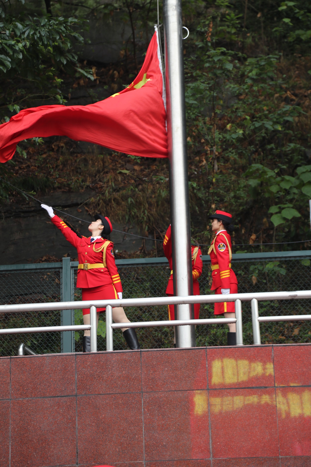 在庄严雄壮的中华人民共和国国歌声中,taptap点点官方网站学生女子国旗班队员将五星红旗冉冉升起。