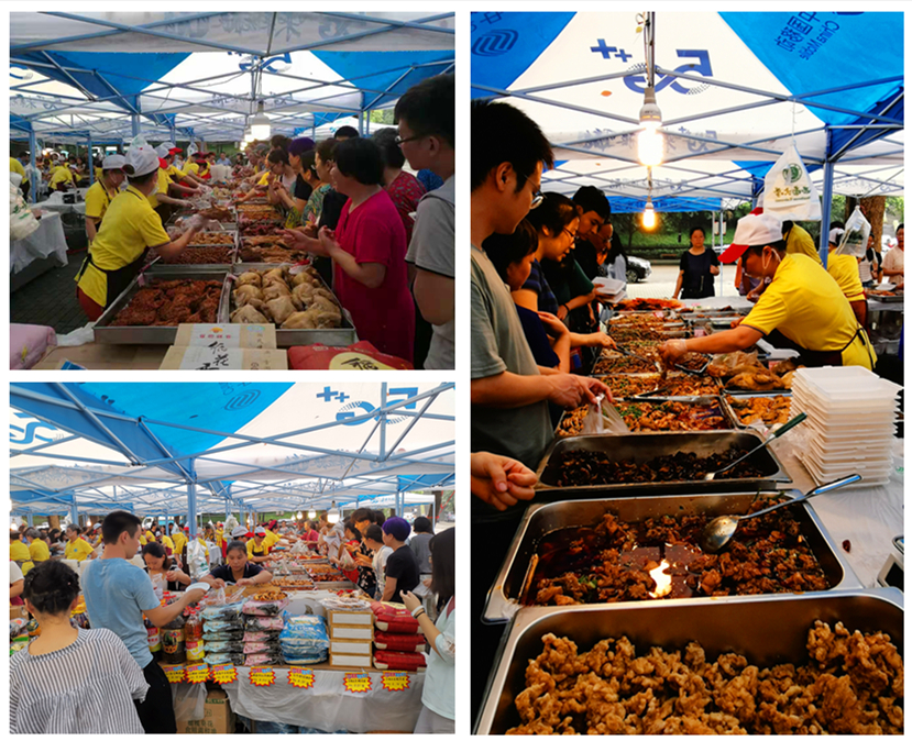 9月9日上午,南北区樟树林一派热闹景象,200余种自制特色菜品、10大类32种生活用品都经过精心挑选,深受广大师生员工喜爱,各大食堂的招牌菜如卤香牛肉、橙香猪手、香煎带鱼、口水鸡等更是成为抢手货。经营服务中心现场向65岁以上的离退休教职工发放了惠民服务卡,承诺全年为他们提供将粮油类等较重的生活物资免费送货到家的服务,受到老人们的好评。