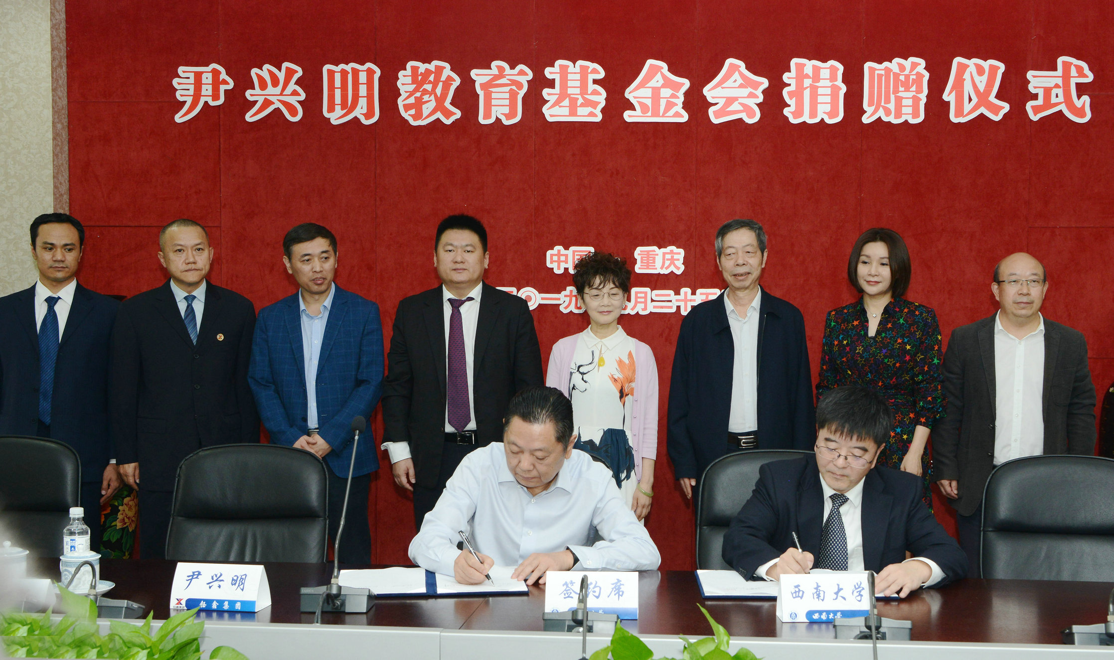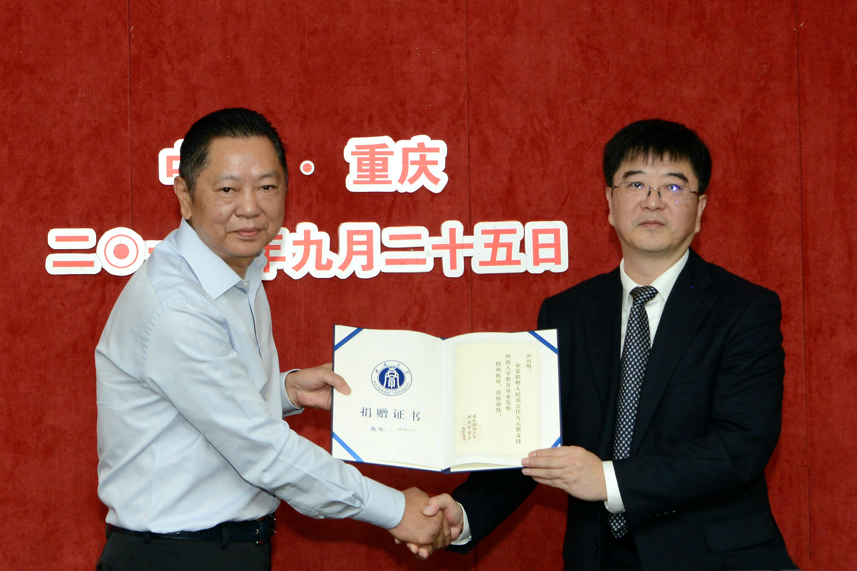 会上,李旭锋书记代表学校与尹兴明校友签订了捐赠协议,颁发了捐赠荣誉证书,潘洵副书记接收了捐赠支票,并向尹兴明赠送了校园文化纪念品。