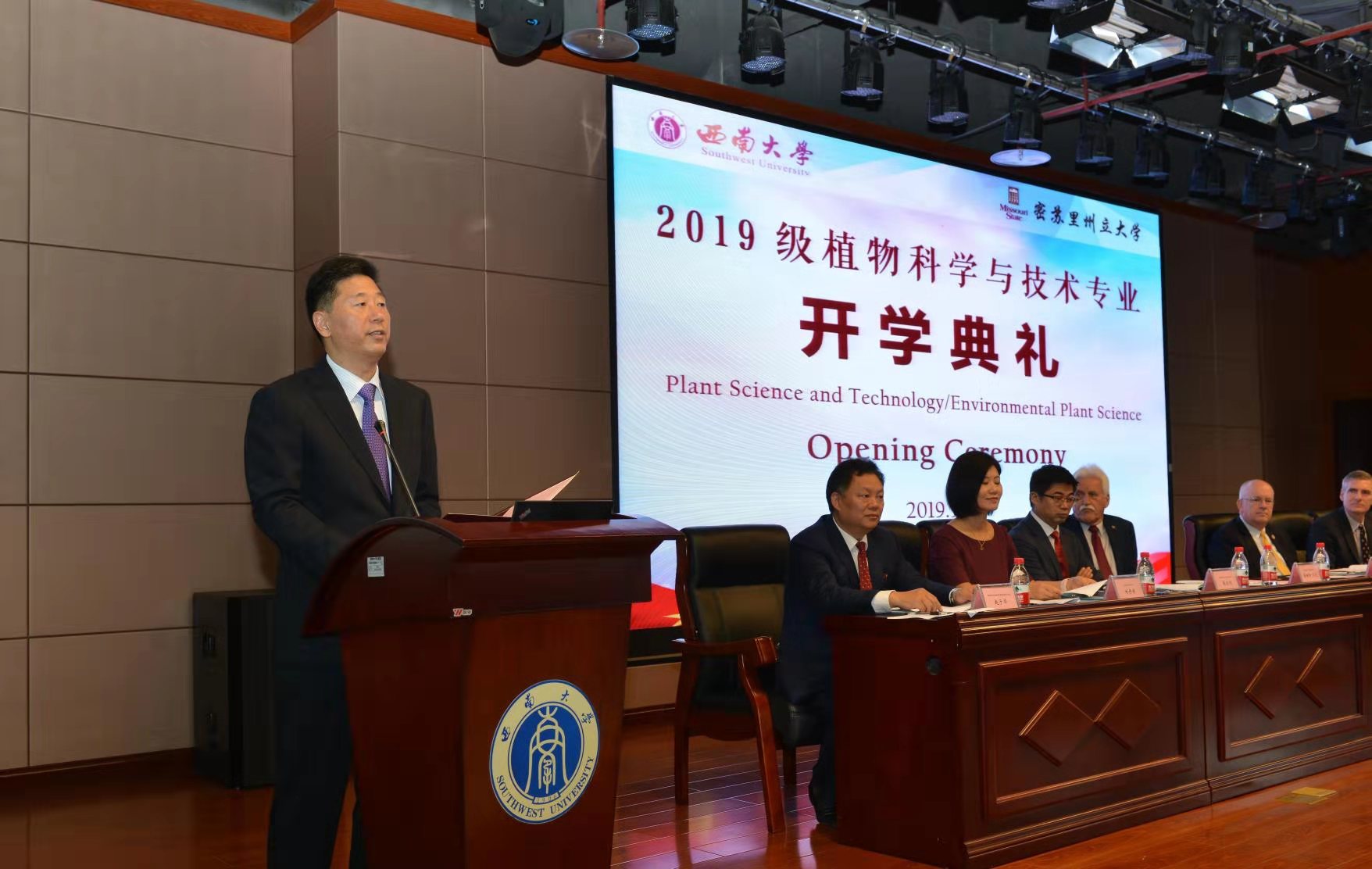 26日上午,农学与生物科技学院举办2019届植物科学与技术专业中外合作办学项目开学典礼,斯玛特校长一行和学校靳玉乐副校长出席典礼,学院党政负责人、112名新生及部分家长代表参加典礼。斯玛特校长和靳玉乐副校长分别代表双方学校致辞,祝贺项目的成功启动。开学典礼与庆祝新中国70华诞主题相结合,内容精彩纷呈,现场氛围热烈。