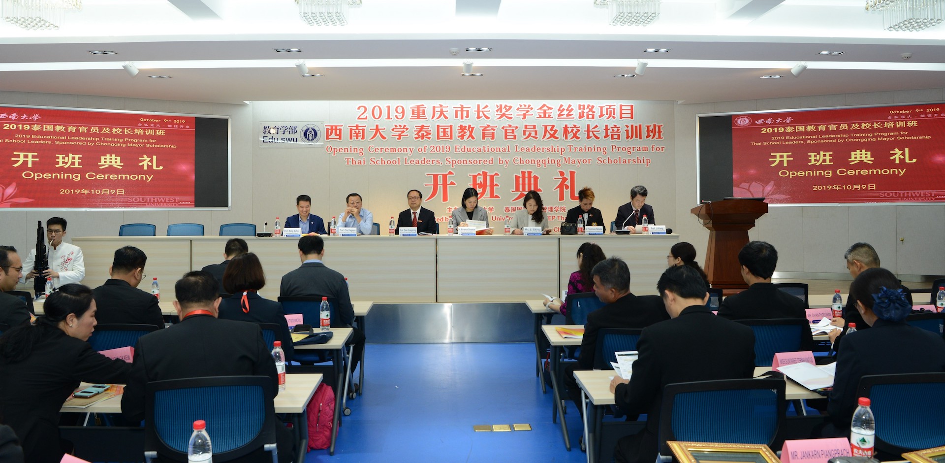 10月9日,2019年重庆市人民政府市长奖学金丝路项目——“泰国教育官员及校长培训”开班典礼在教育学部举行。泰国驻成都总领事馆副总领事万兰梦、泰国国家教育行政管理学院副院长帕安差丽、重庆市教委国际合作与交流处处长李世玉、学校校长助理周光明,教育学部相关负责人、专家以及30名泰国教育官员及校长出席开班典礼。
