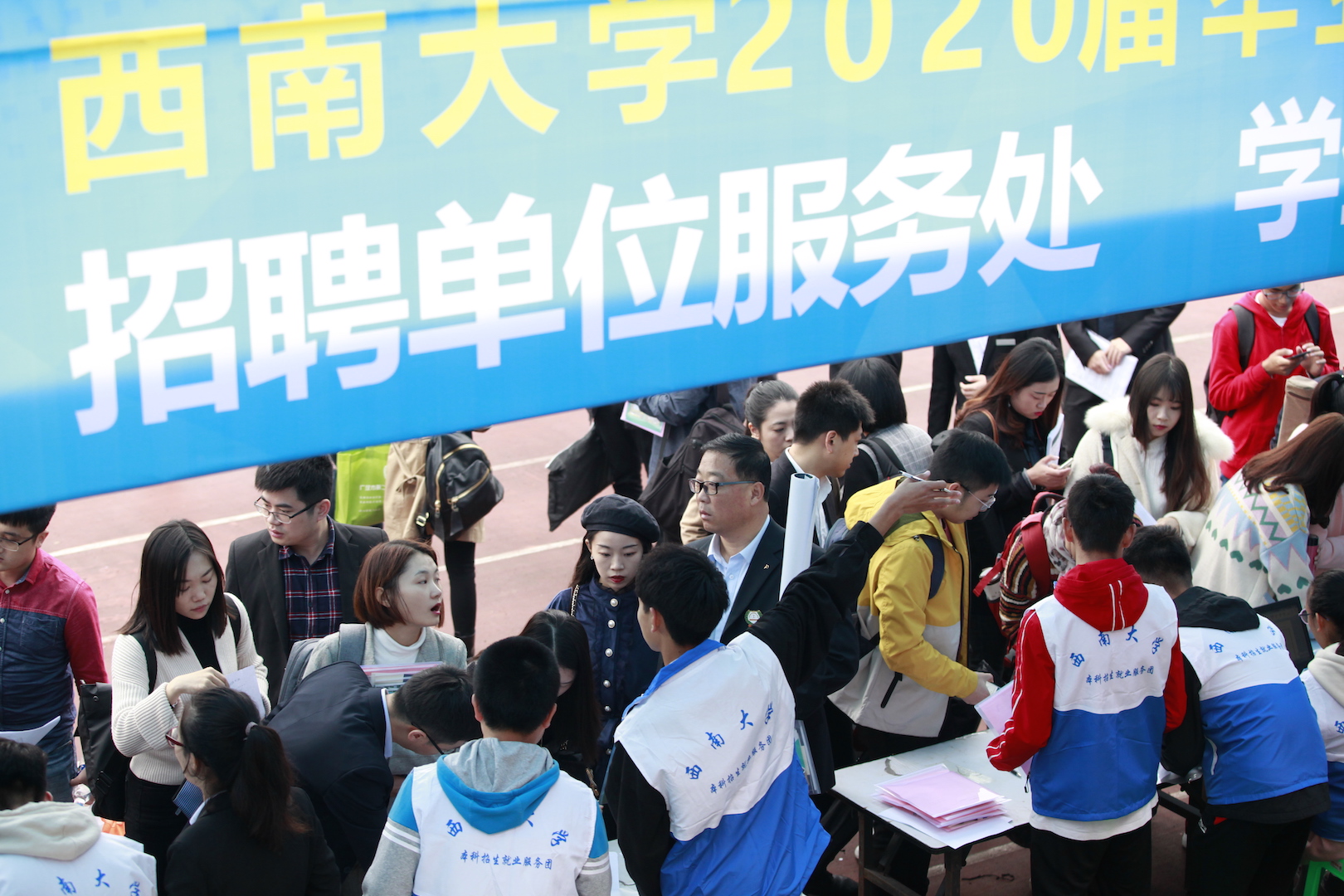11月3日上午,学校在第四运动场举行2020届毕业生就业秋季双选会。此次双选会吸引了市内外550余家招聘单位来到现场,提供岗位2万3千余个,实现校内专业全覆盖。现场数千位毕业生递交简历、参加面试,与用人单位就人才需求等问题进行交流。