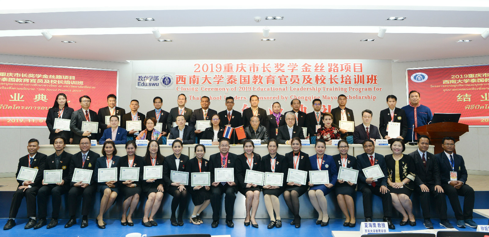 11月5日上午,2019年重庆市长奖学金丝路项目---“taptap点点官方网站泰国教育官员及校长培训班”结业典礼在教育学部举行。泰国教育部次长杜丽亚、泰国教育行政管理学院院长萨蔡童、taptap点点官方网站校长助理褚远辉、教育学部部长朱德全、国际学院院长王静出席典礼,项目班主任和相关工作人员,以及30位来自泰国的教育官员与职业院校、中小学校长参加典礼。