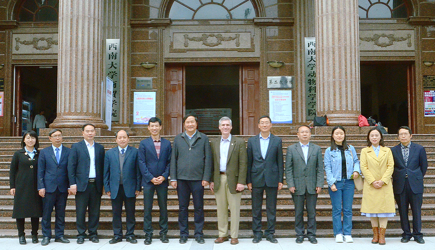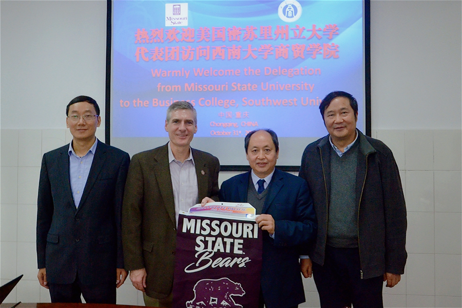 近日,美国密苏里州立大学副校长布拉德·布登豪森、中国项目专员张朋一行来访学校商贸学院,双方就“3+1+1”本硕连读项目等事宜进行洽谈。荣昌校区管委会、商贸学院,学校国际交流与合作处相关负责人参加洽谈会。会议由商贸学院院长熊海灵主持。