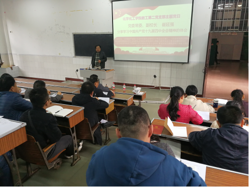 按照学校党委统一工作部署,结合学校、学院党委“不忘初心、牢记使命”主题教育有关安排,化学化工学院党委教工第二党支部于11月15日开展支部主题党日活动。学校党委常委、副校长崔延强出席并进行指导,化学化工学院党委书记、副院长梁大明,党委副书记、院长李念兵,教工第二党支部全体党员参加会议。