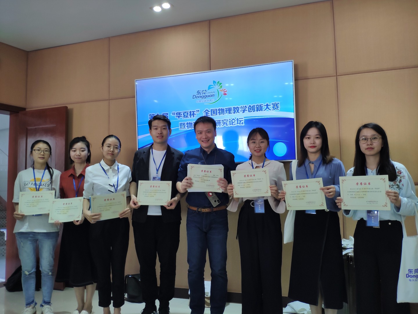 第七届“华夏杯”全国物理教学创新大赛暨物理教育研究论坛近日在广东省东莞市举办。学校物理科学与技术学院7名研究生在邓磊副教授带队下参加比赛。经过激烈角逐,学校喜获一等奖5名,二等奖1名,三等奖1名,1名同学参与优质课录课展示,学校获“优秀组织奖”。