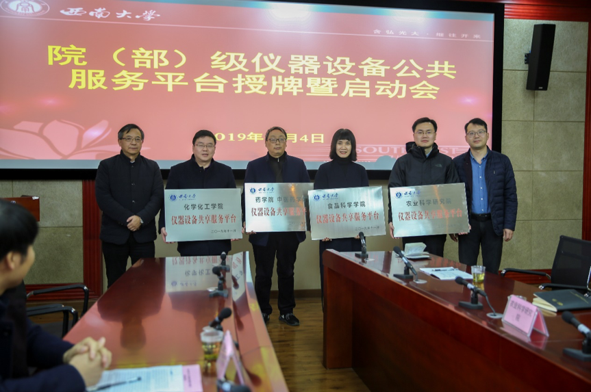 实验室与设备管理处处长袁若介绍了学校首批院(部)级仪器设备共享服务试点平台的遴选过程,宣布了首批试点平台名单并现场进行了试点平台的授牌仪式。分别是化学化工学院仪器设备共享服务平台、食品科学学院仪器设备共享服务平台、药学院/中医药学院仪器设备共享服务平台、农业科学研究院仪器设备共享服务平台。