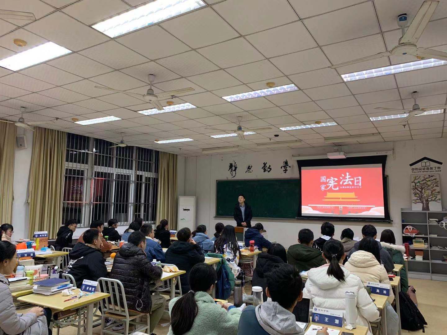 12月4日,借助学校“两早一炼”早读平台,法学院法律援助特设党支部的学生党员带领学校学生开展“宪法晨读”活动,在朗朗书声中学习和宣传宪法。学校还与重庆工商大学研究生会在重庆工商大学图书馆报告厅联合举办法治宣讲进校园活动;邀请马克思主义学院靳玉军教授作题为“坚持和完善中国特色社会主义制度推进国家治理体系和治理能力现代化”的讲座。