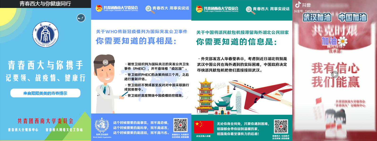 线上积极创作网络文化产品。详实丰富的微信推文、生动鲜活的电子海报、短小精悍的抖音视频、朗朗上口的顺口溜、图文并茂的H5微场景、坚持不懈的“青年大学习”……近日,学校各级团属青年全媒体中心制作的疫情防控相关网络文化产品,用青年学生喜闻乐见的方式帮助大家及时、有效、准确地掌握热点信息,尤其是“@青春西大,用事实说话”系列电子海报和“青春西大与你健康同行”H5都迅速刷屏学生朋友圈和QQ空间,都起到了指导澄清虚假消息、积极传播向上能量、树立正确舆论导向的良好作用。同时,学校全体专兼职团干部和学生会成员充分利用线上媒体平台及时将学校党委和团市委关于疫情防控的相关要求和工作部署宣传到位,并通过QQ、微信、微博等媒体平台密切关注青年学生的心理和思想动态,通过积极互动和留言进行关怀引导。校学生会还制作了电子承诺卡片,引导同学们提高防范意识,万众一心、共抗疫情。