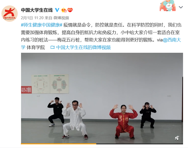 国家体育总局运动医学研究所运动健康中心主任厉彦虎接受人民网采访时建议,居家期间每天应该保持一定的运动量,积极防护增强免疫力。梅花五行桩健身法面向学校师生乃至社会的推广,既能向市民普及科学健身知识,又能广泛宣传居家健身的重要性,倡导了一种疫情防控时期的健康生活方式,助力国家早日成功抗击疫情。