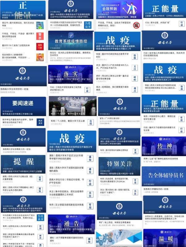 为全面做好新冠肺炎疫情防控特殊时期宣传工作,坚决打赢疫情防控阻击战,学校党委宣传部、党委网络工作部在学校疫情防控指挥部的统一部署下,充分利用官方网络新媒体矩阵,及时发布相关通知通告及防控工作安排,普及科学防控知识,挖掘一线师生“战疫”故事,引导广大师生员工理性应对疫情,在网上吹响“战疫”集结号。在不到一个月的时间里,学校官方微信共发布“战疫”相关推文65篇;官方微博推送疫情相关内容71条;官方抖音等视频平台共发布各类师生原创短视频15个。其中,官方微信通过搜集整理留校师生抗击疫情的真实事例,发布《请放心,我在taptap点点官方网站很好!》等系列推文,生动还原学校防疫工作启动以来师生携手共克时艰的点点滴滴;通过整合西大学子抗疫事迹,发布《我们是青年一代,我们想做更多!》等系列推文,展现每一个西大学子面对疫情时的责任与担当。官方微博发起网络接力“我承诺,防控疫情,有我”行动,吸引数千名师生参与,纷纷在微博留言,承诺以身作则,防控疫情。相关推文、微博引起师生、校友强烈反响,引起社会广泛关注,在网上凝聚了西大人抗击疫情的力量。