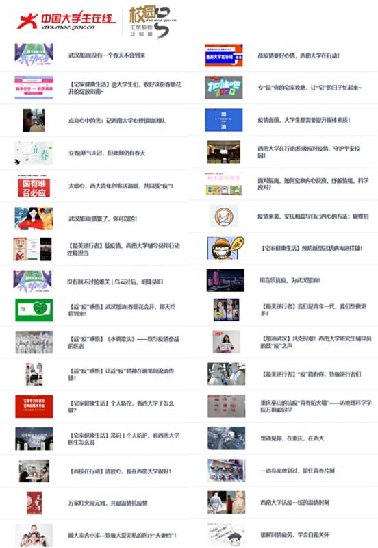为落实教育部思政司关于做好疫情防控宣传工作要求,充分利用教育部中国大学生在线“校园号”平台,学校以第一批入驻高校身份,积极通过该平台发布学校“战疫”动态、感人故事、网文作品等共计30余篇,其中27篇被教育部中国大学生在线官网“高校战疫”、“高校联播”等栏目采纳,中国大学生在线微博、微信、抖音、喜马拉雅FM等新媒体平台均对学校新媒体推送内容进行多次转载,受到广大学生群体关注,在网上传递了西大人战胜疫情的信心和决心。