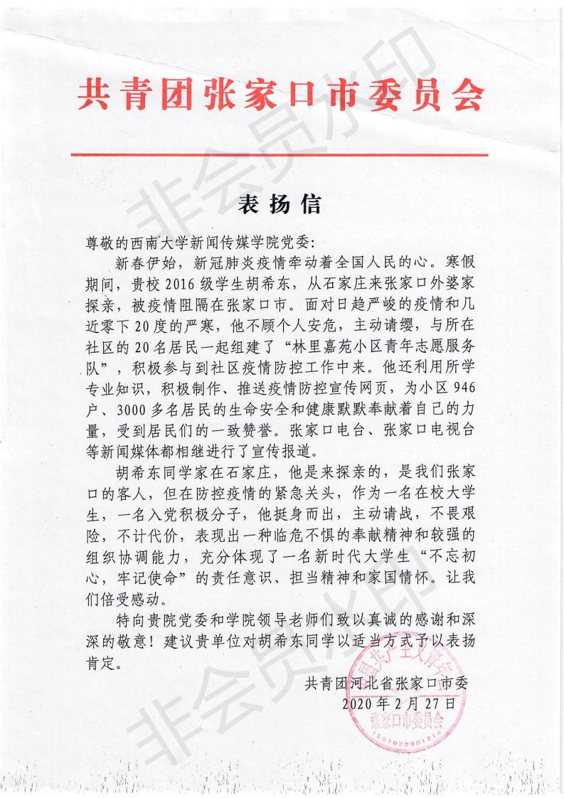 近日,新闻传媒学院2016级本科生胡希东参与组建了张家口市第一支由居民自发组建的志愿者防疫服务队。防疫期间,除了对本社区出入的行人及车辆进行出入证审查,胡希东还利用所学专业知识,积极制作、推送疫情防控宣传网页,有效提升疫情防控专业知识的传播度和普及度,进一步保证了小区946户、3000多名居民的生命安全和健康。在该志愿服务队的带领下,张家口市其他小区也积极行动起来,陆续组建起自己小区的居民志愿服务队,广泛凝聚了张家口市社区防疫工作力量。