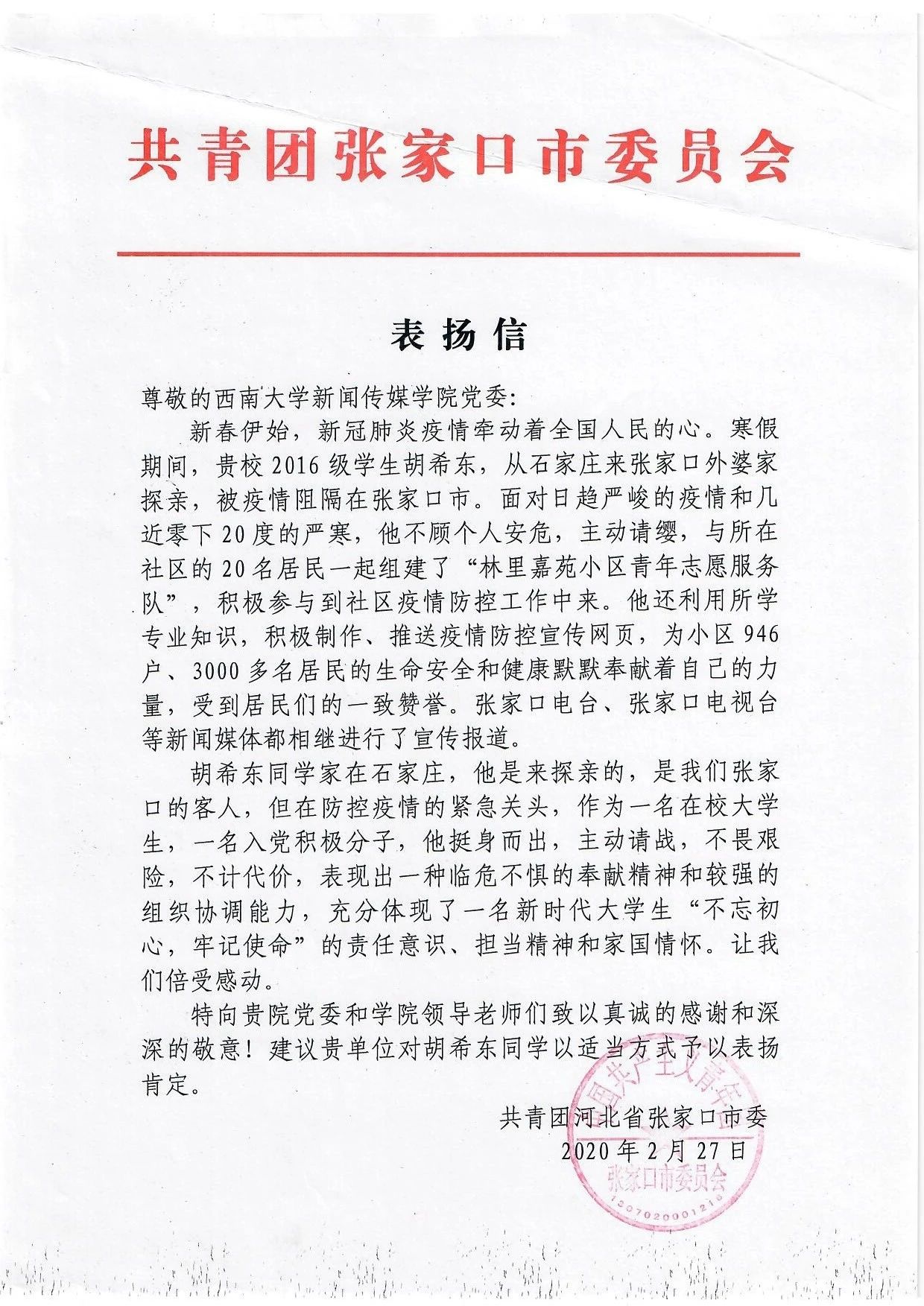 taptap点点官方网站新闻传媒学院2016级本科生胡希东参与组建了张家口市第一支由居民自发组建的志愿者服务队。在该志愿服务队的带领下,张家口市其他小区也积极行动起来,陆续组建起自己小区的居民志愿服务队,广泛凝聚了张家口市社区防疫工作力量。对此,河北省张家口市委专门寄来了表扬信。