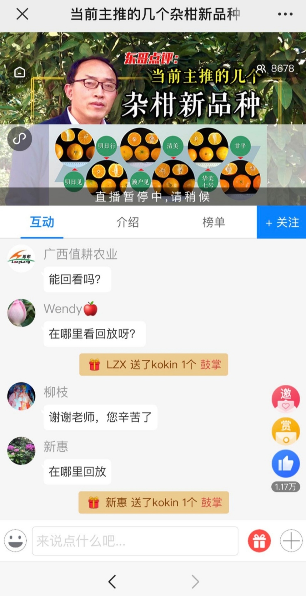 这样新颖的方式第一次就取得了良好的效果。在江东的第一课“当前主推的杂柑新品种”中,介绍了新品种的选育引种过程、果实品质表现、树体生长结果特征、栽培技术要点等,来自全国各地的果农、技术专家和大学生进入直播间超过8600人次,课间提问咨询互动达到1.2万人次,不少人互动留言要求开设课后点播,以便今后生产实践中反复学习实践。