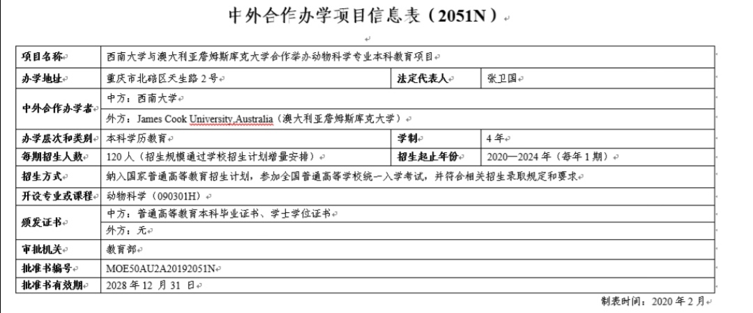 根据《中华人民共和国中外合作办学条例》及其实施办法,教育部对2019年下半年各地上报的中外合作办学项目进行评审。近日,教育部公布评审结果,全国共有44个本科及以上中外合作办学项目获批。依照专家评议结果,学校与澳大利亚詹姆斯库克大学合作申报的动物科学本科项目成功获得教育部批准,批准书编号MOE50AU2A20192051N。