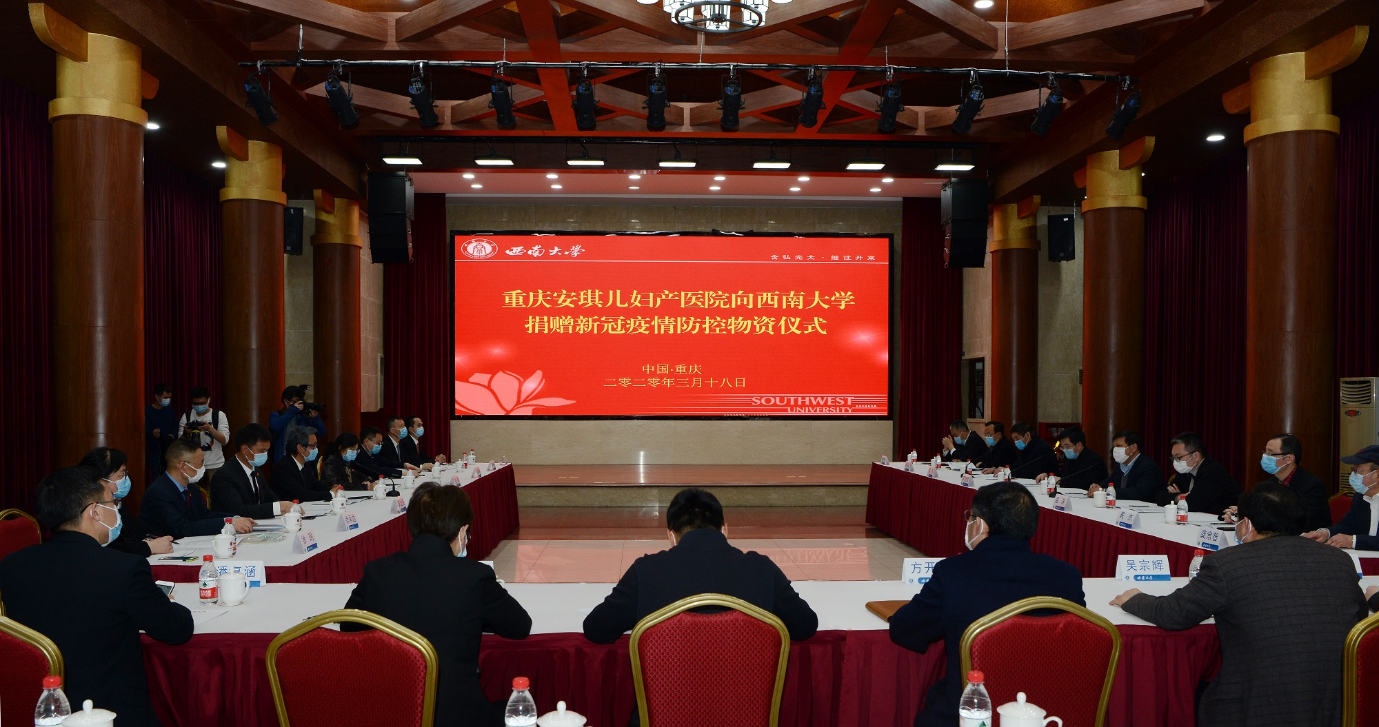 在捐赠仪式上,党委书记李旭锋讲话,对重庆安琪儿妇产医院及安琪儿医疗控股集团的善举表示衷心感谢和诚挚敬意!在这场疫情防控的人民战争、总体战和阻击战中,安琪儿医疗控股集团一方面扎实有效地做好旗下各院区的一线防疫工作,另一方面积极开展防疫物资捐赠活动,充分彰显了一家大型医疗企业的责任与担当,为打赢疫情防控阻击战贡献着积极的力量,也为学校缓解了物资匮乏的燃眉之急。我们一定管好用好这批医疗防护物资,确保用到疫情防控最需要的地方。