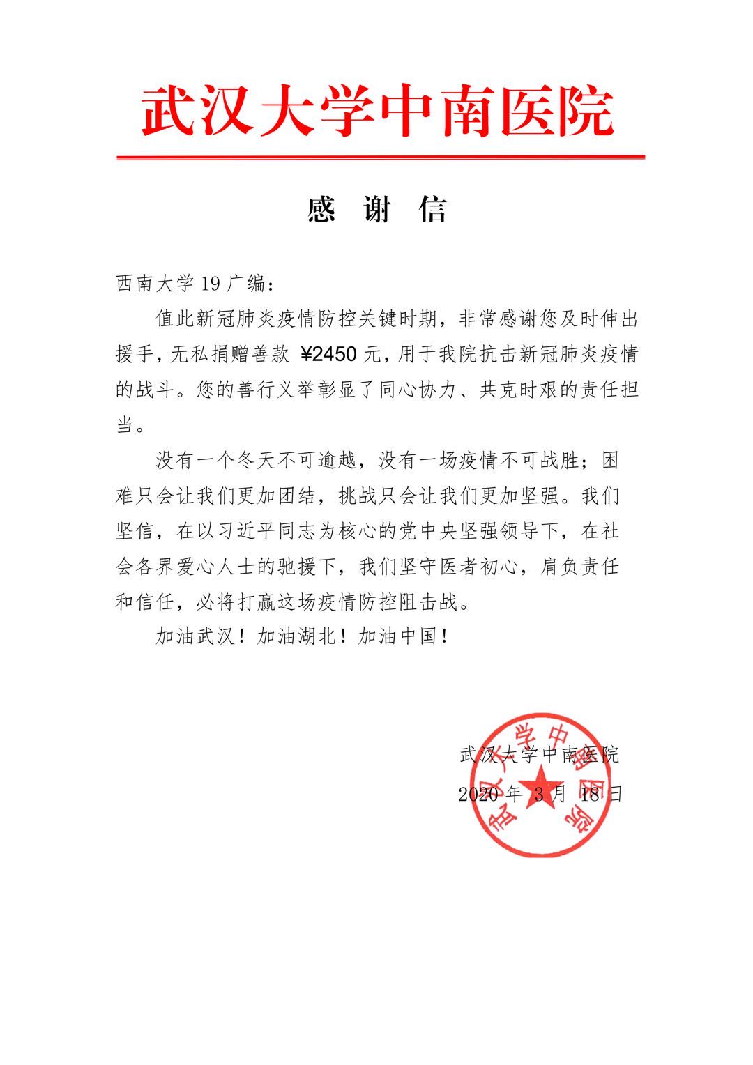 同学们在多方联系咨询下确认了武汉大学中南医院的捐款渠道。2月13日,2019级广播电视编导专业的同学们发起倡议,全体同学积极参与捐款。此次募集共收到2450元的爱心捐款,并于当晚通过网上银行向武汉大学中南医院汇去该项捐款,为该医院医疗物资的采购贡献一丝力量。