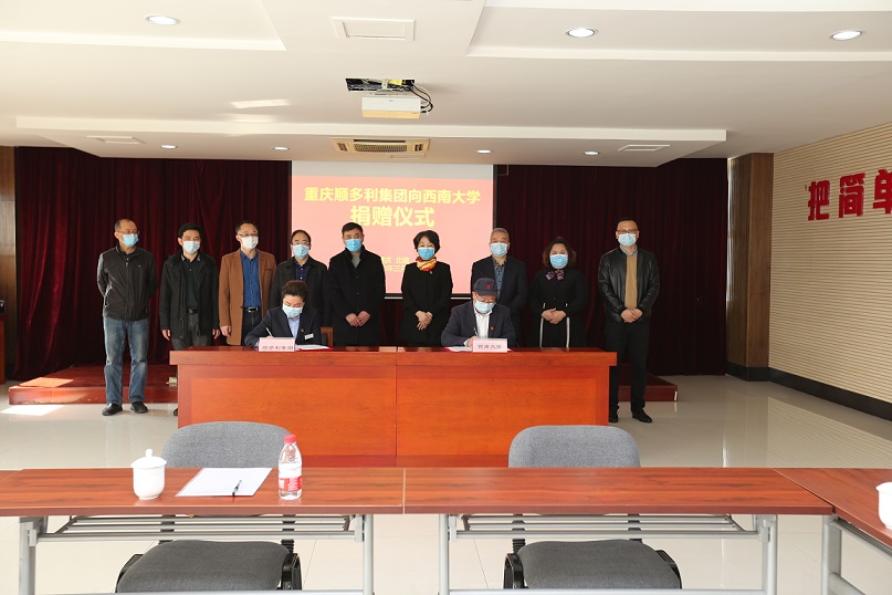 3月20日,重庆顺多利集团向学校捐赠仪式在顺多利集团会议室举行。重庆顺多利集团董事长周继群,总经理邓力,副总经理朱雯钰,考试中心总经理杨帆,北碚区委常委、统战部部长吴萍,统战部副部长胡强,学校党委副书记潘洵,对外联络部、保卫处、后勤集团相关负责人出席仪式。