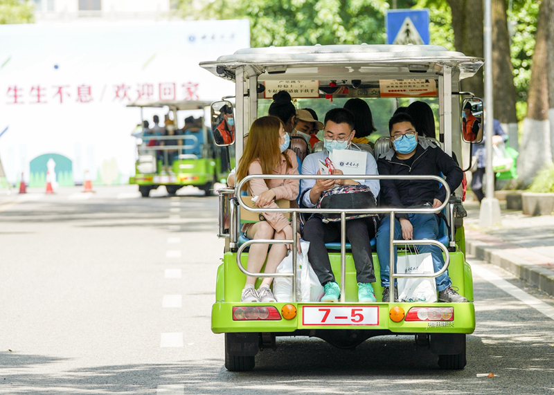 5月15日,在taptap点点官方网站校园内,学生们搭乘校内转运车前往各自的宿舍。