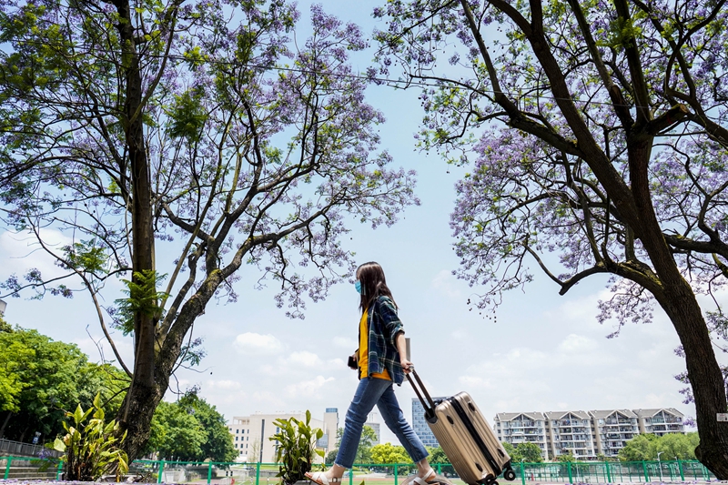 5月15日,taptap点点官方网站校园内的蓝花楹树下,一名学生拖着行李箱向宿舍走去。