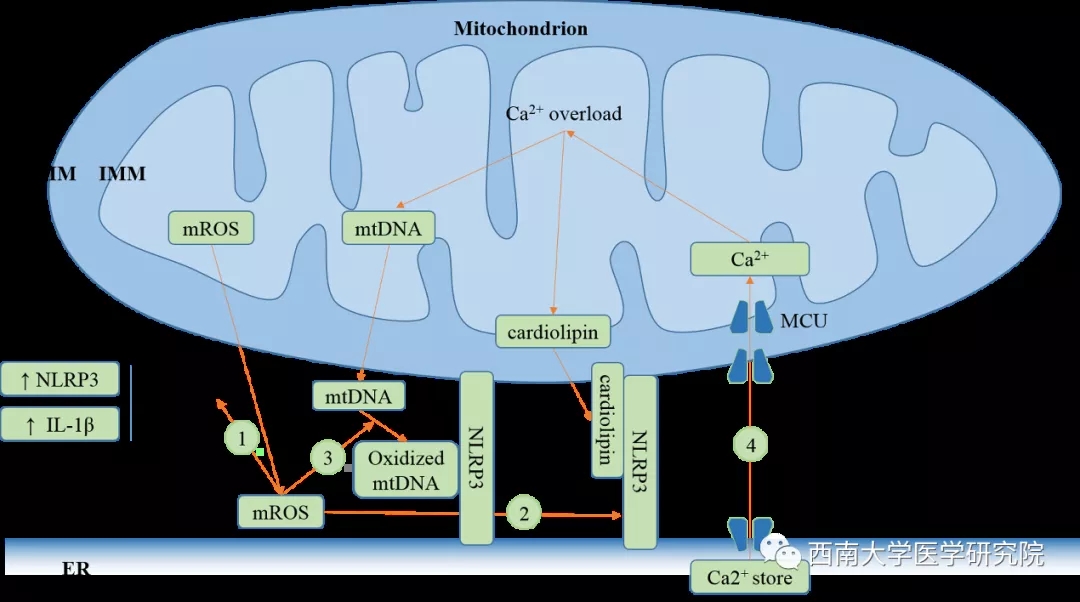 早在1961年电子显微镜下发现小鼠和成年豚鼠卵巢的线粒体结合的内质网膜(mitochondria-associatedER membranes,MAMs)存在连续的部分,并在1990年大鼠肝脏中作为独特的结构成分分离出来。MAMs的间隙约10-25nm,为NLRP3的激活提供了环境。线粒体释放的DNA被活性氧簇(ROS)氧化,以及迁移到线粒体外膜的心磷脂结合并激活NLRP3,引起NLRP3募集ASC和caspase-1,组装形成NLRP3炎性小体。内质网钙离子储库释放的钙离子可迅速被线粒体摄取激活NLRP3炎性小体。内质网应激过程中,NF-κB通路激活,促进NLRP3炎性小体中的NLRP3及其底物IL-1β表达上调,即致敏(priming),同时IRE1α和PERK与BiP解离,促进NLRP3定位到NLRP3以及凋亡(apoptosis)的发生,凋亡作为NLRP3炎性小体的第二信号,促进其激活。脂质是细胞膜的重要组成成分,并参与信号转导。内质网中卵磷脂/磷脂酰肌醇胺比例升高,引起钙离子转运活性增强,钙离子从储库中快速迁移出去,引起胞浆游离的钙离子浓度升高,游离的钙离子被线粒体摄入后激活NLRP3炎性小体。胆固醇是一种重要的脂质,胆固醇迁移进入内质网后促进炎性小体活化。