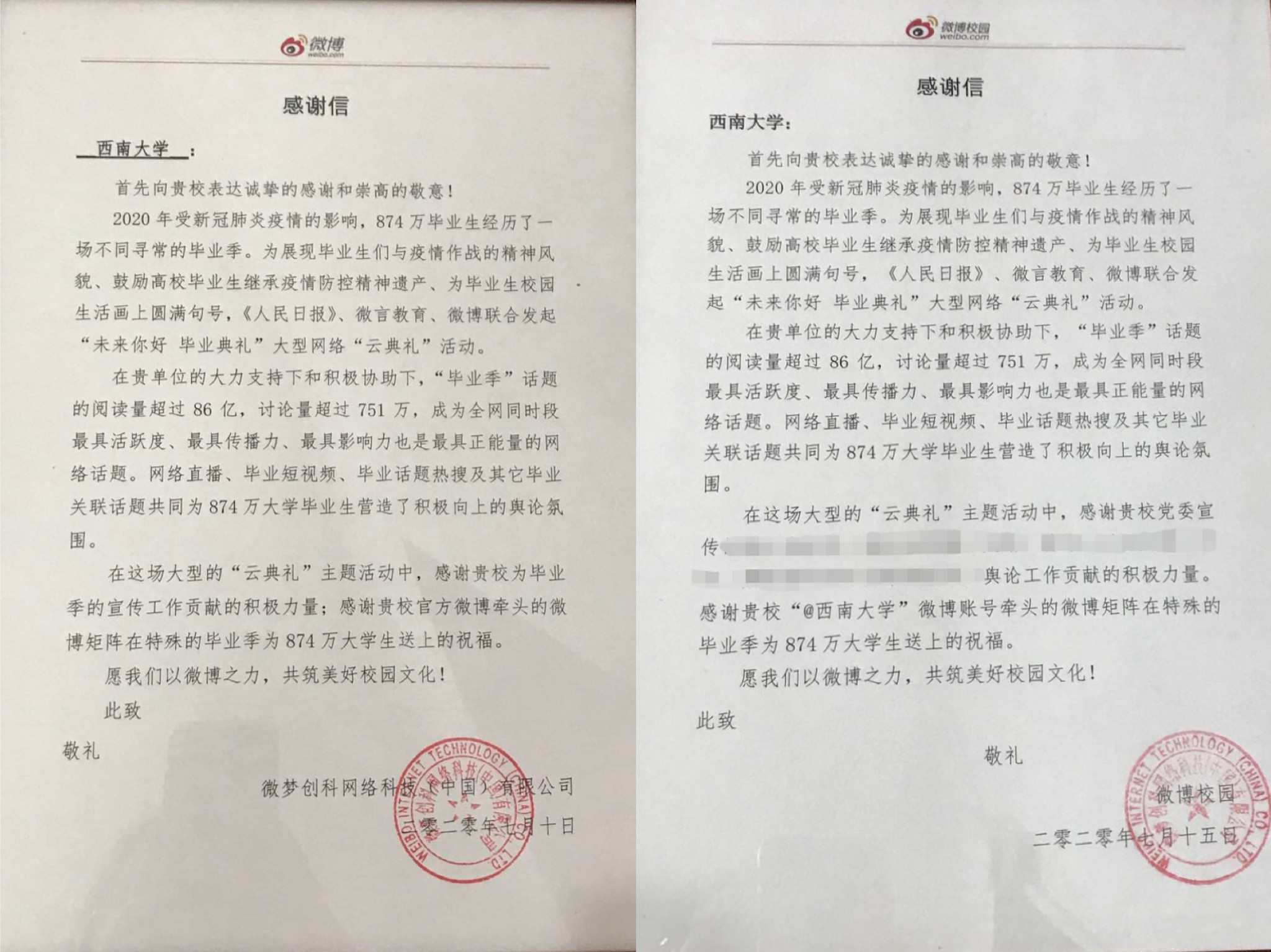 受新冠肺炎疫情的影响,学校2020届1万余名毕业生与全国874万毕业生共同度过特殊难忘的毕业季。这个毕业季,学校官方微博积极参与《人民日报》、微言教育及微博联合发起的“未来你好 毕业典礼”大型网络“云典礼”活动,取得圆满成功。