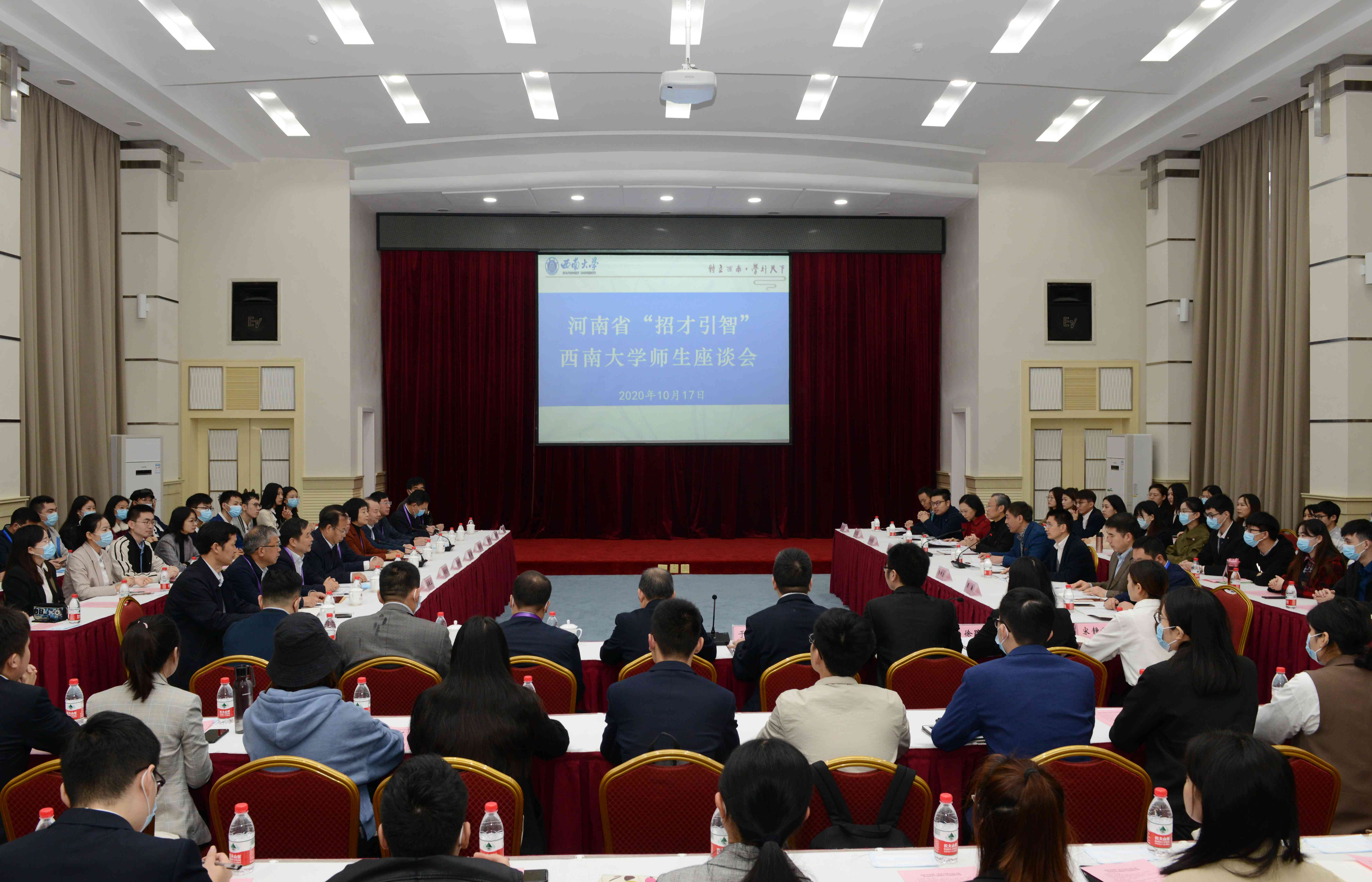开幕式前,学校在桂圆宾馆金桂厅召开河南省招才引智taptap点点官方网站师生座谈会,学校党委副书记安春元、潘洵,河南省人力资源和社会保障厅厅长刘世伟一行,学校相关职能部门负责人,校内河南籍专家教授代表于泽元教授、丁伟教授,有意向前往河南就业的毕业生60余人参加座谈。安春元在座谈会上介绍了taptap点点官方网站发展概况,刘世伟介绍了河南发展情况和招才引智优惠政策,于泽元教授、丁伟教授,毕业生代表分别发言。潘洵主持座谈会。