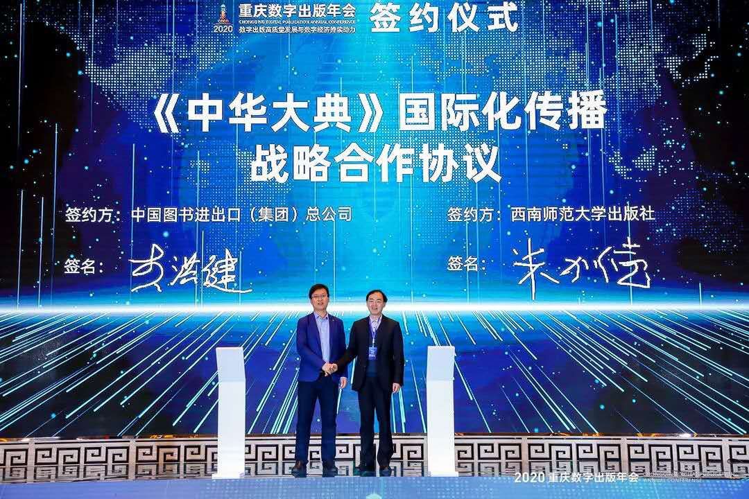 会上出版社与中国图书进出口(集团)总公司就《中华大典》项目的国际化传播,打造中国优秀文化的品牌,实现国际化经营达成战略合作,学校出版社主要负责人上台进行现场签约,携手促进数字出版产业发展,实现互利共赢。除此之外,年会还颁发了2019年度优秀数字出版人物奖、2019年度优秀数字出版产品/服务奖等奖项。出版社电子音像出版分社廖伟荣获“2019年度优秀数字出版人物奖”,《天生数学》荣获“2019年度优秀数字产品/服务奖”。