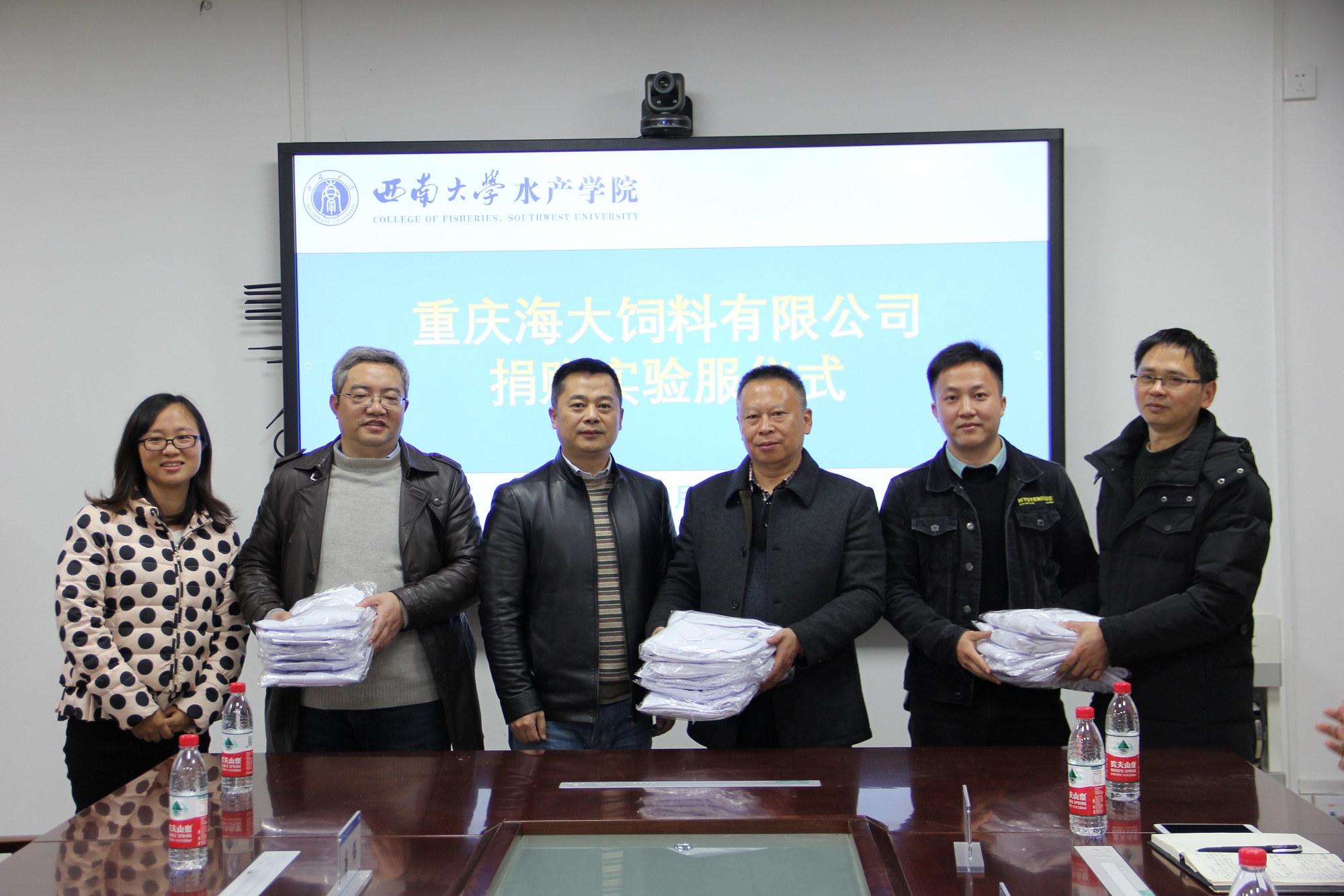 11月25日下午,重庆海大饲料有限公司实验服捐赠仪式在十教举行。重庆海大饲料有限公司(以下简称“重庆海大公司”)总经理赵明远及公司相关部门负责人,水产学院党政领导出席本次捐赠仪式。