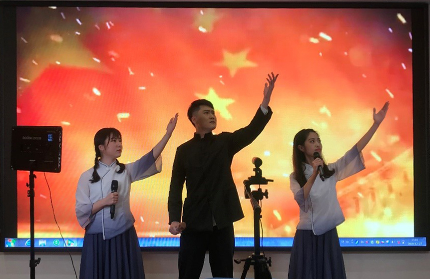 本次总决赛采用线上方式举行,学校代表队通过作品《青年力量,中国力量》将120年前八国联军侵华时爱国青年用行动与声音呼唤着中国崛起的历史和120年后青年志愿者们在新冠疫情面前用青春捍卫中国人民生命与健康的现实巧妙结合,用古今对话的形式表达出“故今日之责任,不在他人而全在我少年”的责任与担当,作品选材新颖、立意独特、内涵丰富、朗诵情感真挚。