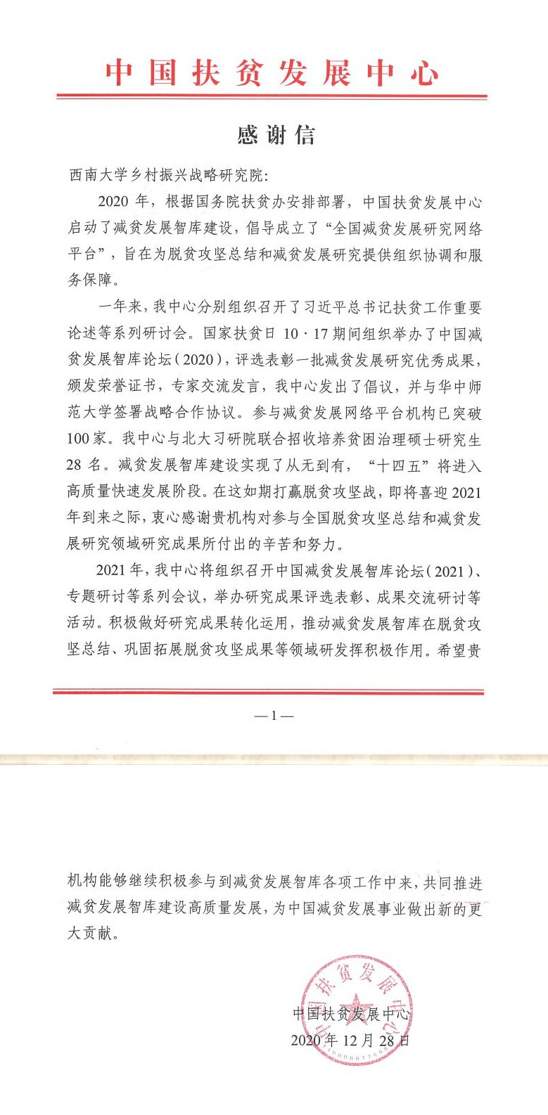 12月28日,学校乡村振兴战略研究院收到国务院扶贫办中国扶贫发展中心的感谢信,感谢研究院对参与全国脱贫攻坚总结和减贫发展领域研究成果所付出的辛苦和努力。