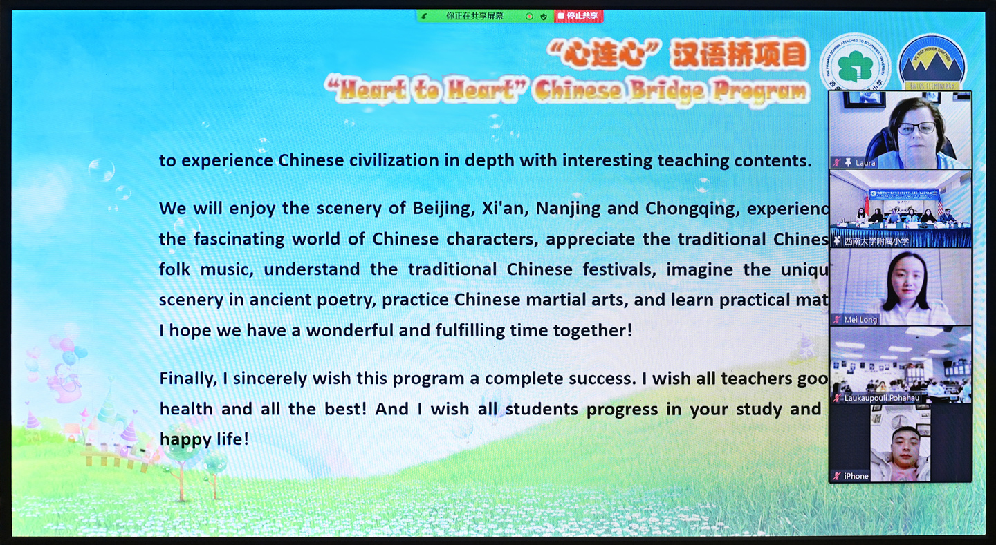 1月4日,由中国教育部中外语言交流合作中心主办,学校承办的taptap点点官方网站附属小学与美国贝兹小学“心连心”汉语桥线上交流项目开营仪式顺利举行。学校附属小学、美国贝兹小学主要负责人出席开班仪式并致辞。参加开营仪式的还有附属小学汉语桥项目授课教师、国际合作与交流处相关负责人以及贝兹小学中文沉浸项目班的60名同学。