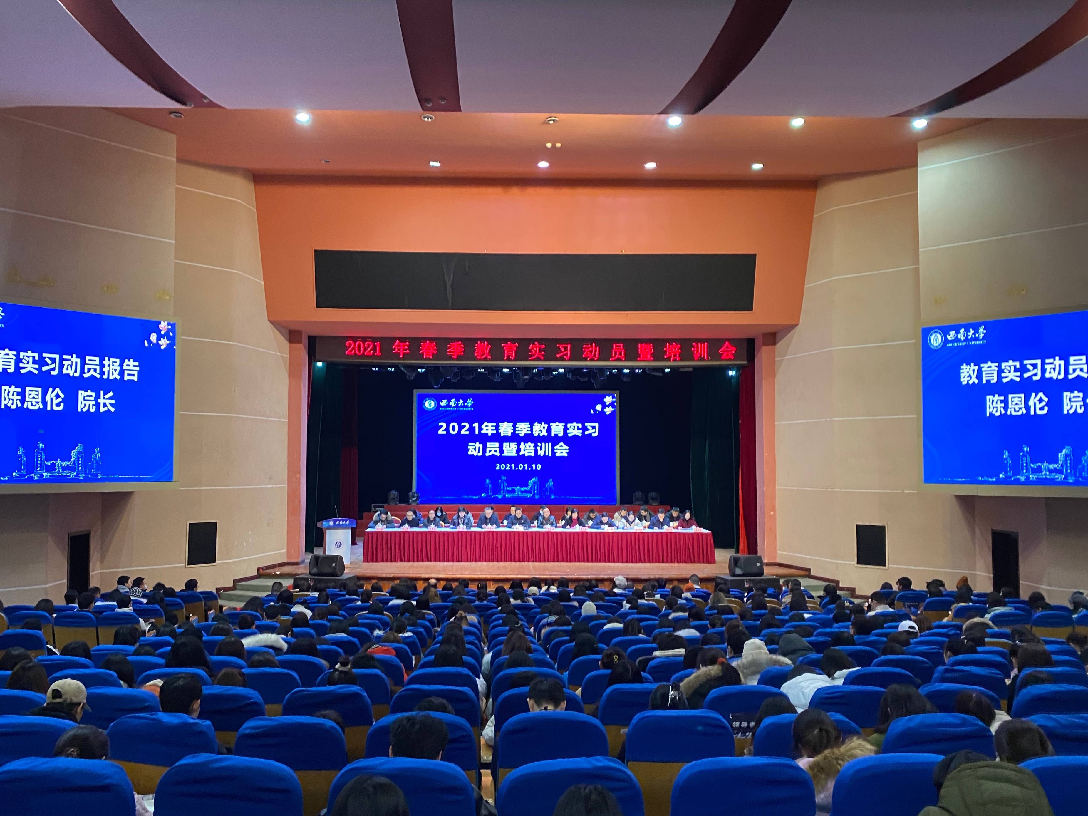 为适应学校教师教育转型改革需要,推进公费师范生实践教学改革,1月10日,学校在光大礼堂主会场与十四个学院(部)分会场举行2021年公费师范生教育实习动员暨培训会。副校长陈时见出席动员会,教务处、学生工作处、招生就业处、教师教育学院主要负责人、师范生培养学院教学及分管学生工作相关负责人、教育实习指导教师、2017级全体公费师范生参加动员会。教务处相关负责人主持动员会。
