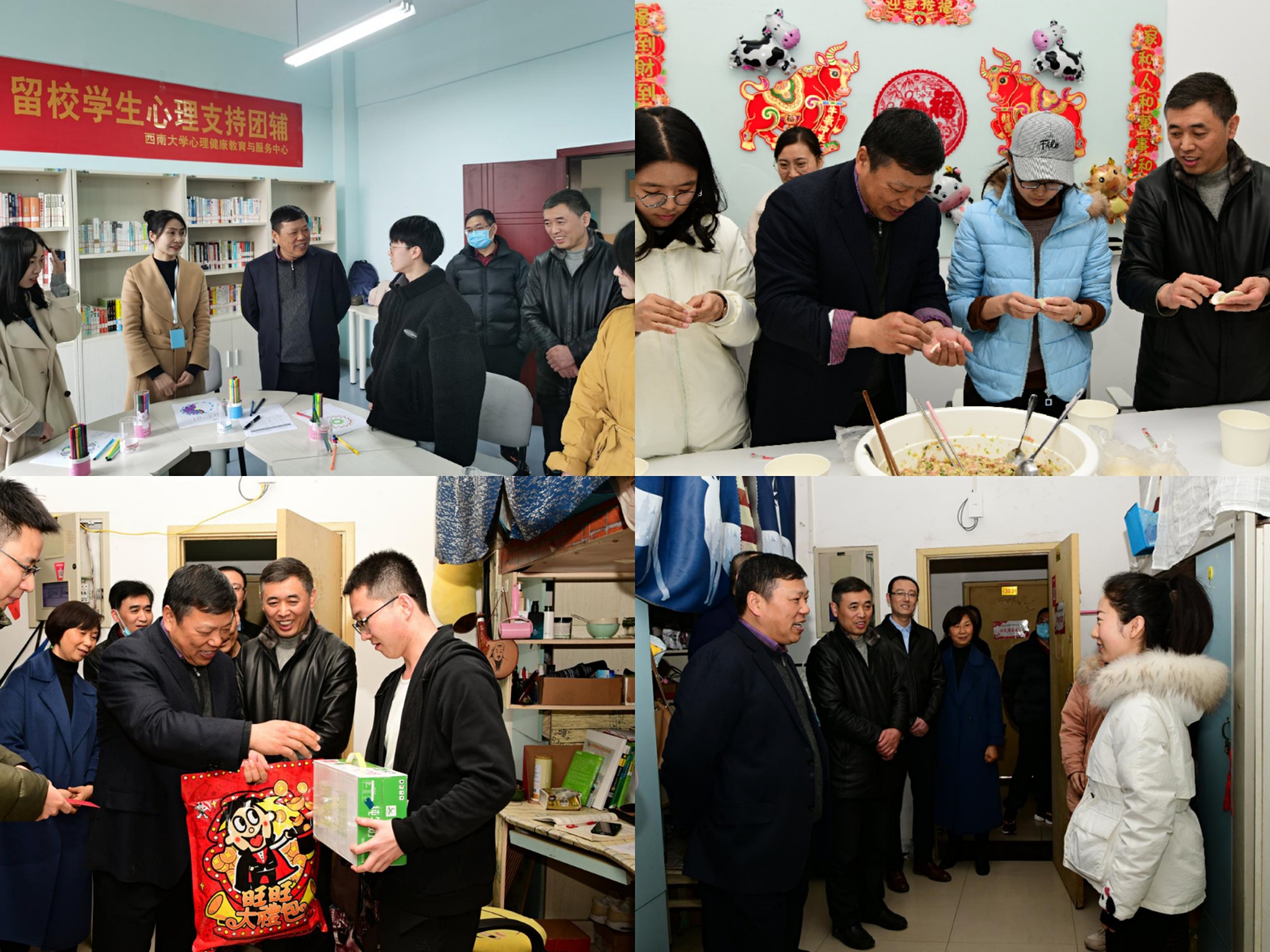 春节临近,校园张灯结彩,处处洋溢着喜庆的节日氛围。2月9日,校长张卫国、党委副书记潘洵带队走访学校心理健康教育与服务中心、竹园学生生活园区“青竹空间”和学生寝室,看望慰问留校学生,学校暖心关怀受到央视等媒体报道。