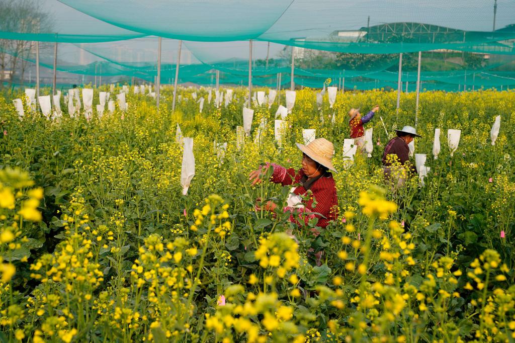 ↑2月22日,在重庆市油菜工程技术研究中心,几名技术工人在油菜花田里劳作。