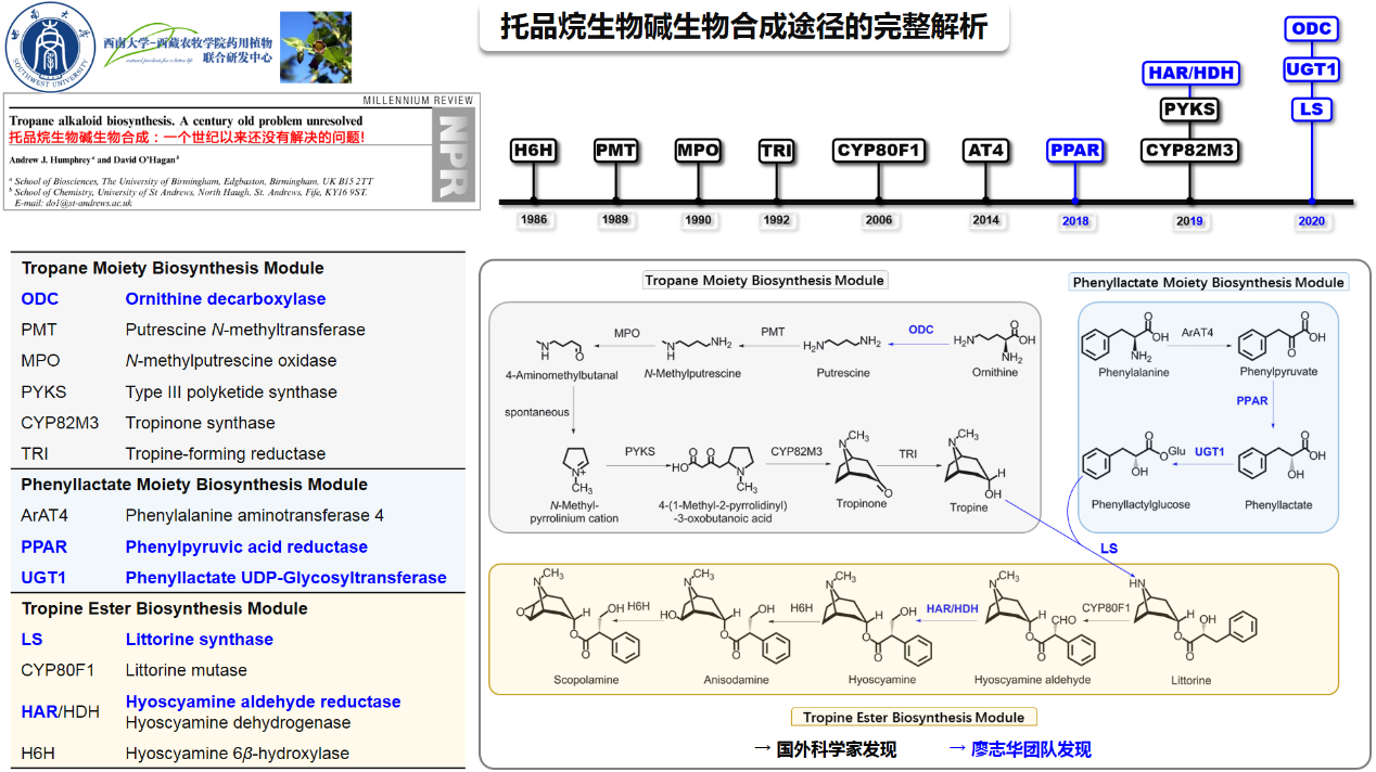 近日,学校廖志华教授团队和中国科学院昆明植物所黄胜雄研究员团队,采用多学科研究方法,发现鉴定了莨菪醛脱氢酶(hyoscyamine dehydrogenase,HDH),该酶又名莨菪醛还原酶(hyoscyamine aldehyde reductase,HAR)。HDH的发现标志着药用TAs生物合成途径的完整解析,终结了国外科学家一个世纪以来没有解决的问题。该研究得到NSFC-云南联合基金重点项目、国家转基因重大专项和国家重点研发计划等项目的资助,相关成果《Biochemical and metabolic insights into hyoscyamine dehydrogenase》于2月18日发表在国际著名期刊《ACS Catalysis》(美国化学学会·催化)。学校生命科学学院含弘博士后邱飞为第一作者,学校生命科学学院博士生曾俊岚和昆明植物所颜一军副研究员为并列第一作者,廖志华教授和黄胜雄研究员为该论文共同通讯作者。