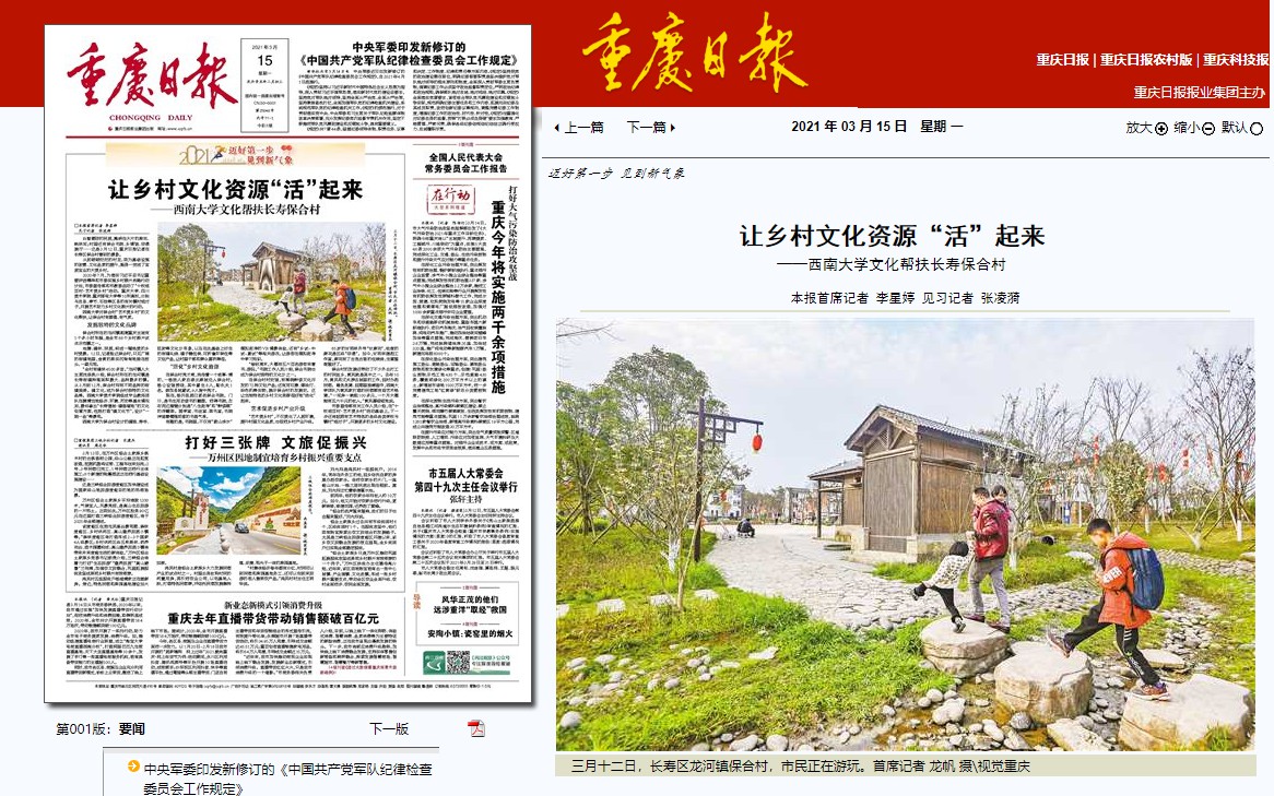 重庆日报3月15日头版头条报道学校助力乡村振兴、文化帮扶长寿保合村工作,具体报道内容如下: