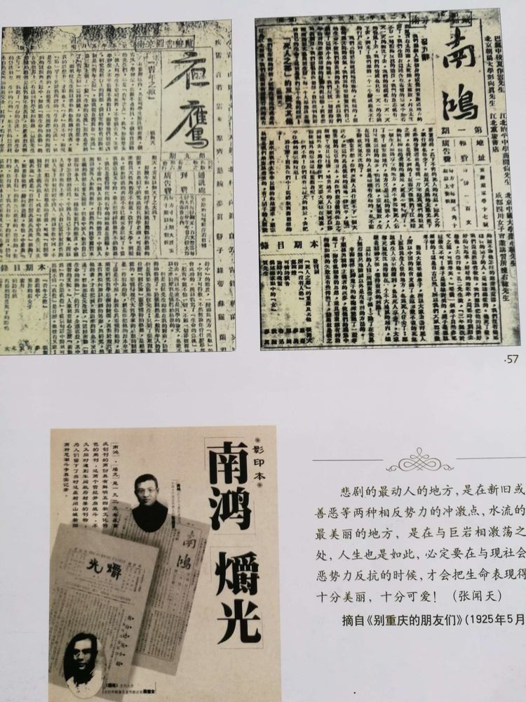 《南鸿》本是由巴县中学毕业生邵正纲、平民公学教员邓雨甘、川东师范学生曹民熙等几人创办,用来以文会友的油印小刊物,不定期出版,影响不大。张闻天到来后,指导他们扩大“南鸿社”,并联络川东师范、巴县中学、二女师等校进步青年,将油印改为铅印,自己亲自任主编,该刊也随即成为重庆传播新文化新思想的阵地。张闻天在接手后的《南鸿》发刊词中写道:“重庆这个地方的空气实在太闭塞、太干燥,并且太沉闷了。”这里的“空气”当然是一种比喻,指当时的重庆仍然是旧思想、旧道德、旧制度统治的地方,闭塞而落后。他旗帜鲜明地指出:“我们反抗一切压抑青年清新的思想与活跃的行动的旧道德、旧思想与旧制度,我们提倡自由思想,自由批判与活泼的新文艺与新生活。”这篇发刊词连同那篇《“死人之都”的重庆及其他》一文,言辞激烈,犹如在一潭死水中扔入一块巨石,引发强烈关注。研究者发现,八期《南鸿》中共登载文章53篇,除发刊词外,张闻天以“张闻天”“罗蔓”“飘蓬”“长虹”“大风”等名发表《纪念孙中山先生》、《生命的激流》等16篇文章,占总量近三分之一,在广大青年中产生了较大反响。