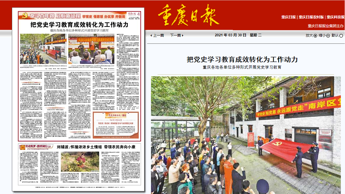 近日,学校机关党委发展规划与学科建设部党支部与国家治理学院党委研究生第六党支部依托校级样板支部共建,联合开展了“弘扬脱贫攻坚精神,激发接续奋进力量”党史学习教育分享会,《重庆日报》予以报道。报道内容如下: